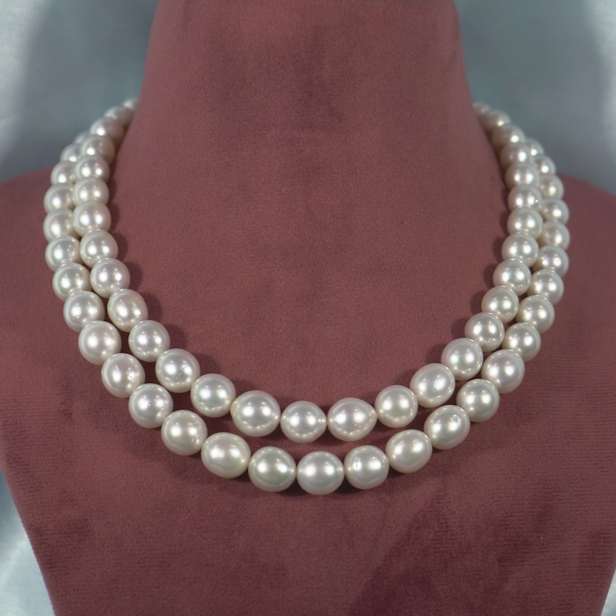 Make a statement with this stunning South Sea pearl necklace, crafted from premium white saltwater cultured pearls. Featuring two elegant rows of 10–11 mm round pearls of AA quality, this 18-inch piece exudes timeless beauty and refinement. Weighing approximately 679.4 grams, it comes with a lifelong guarantee and a Certificate of Authenticity, assuring you of its genuine craftsmanship. Ideal for weddings, formal dinners, or festive events, this necklace complements sarees, gowns, and contemporary wear with equal grace and elegance.