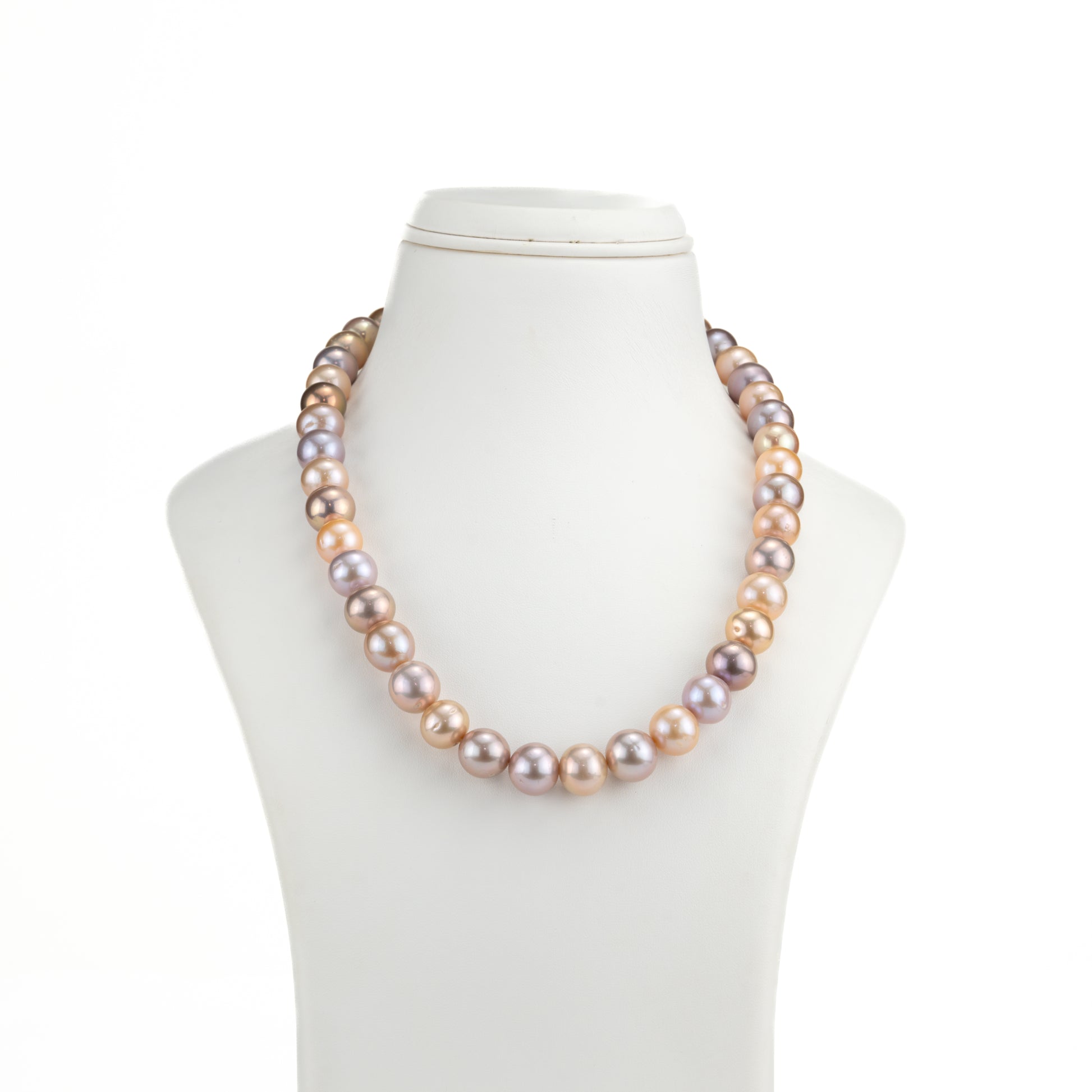 This exquisite necklace set showcases 11.0-12.0mm near round freshwater cultured pearls in a beautiful multicolor arrangement. Crafted in a single 18-inch row, it carries a substantial weight of approximately 96.2 grams, reflecting its premium quality and durability. The AA grade pearls exhibit natural luster and elegance, making this piece a timeless treasure. Backed by a lifelong guarantee, it is a perfect choice for weddings, festive occasions, and as a statement accessory that complements both traditional and modern attire.