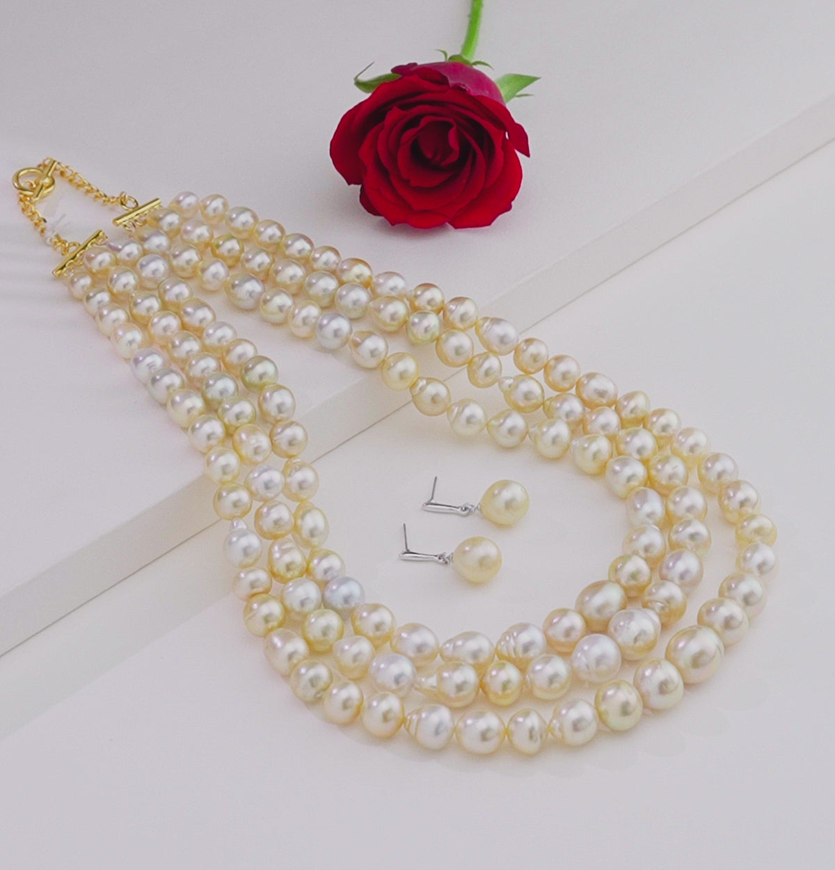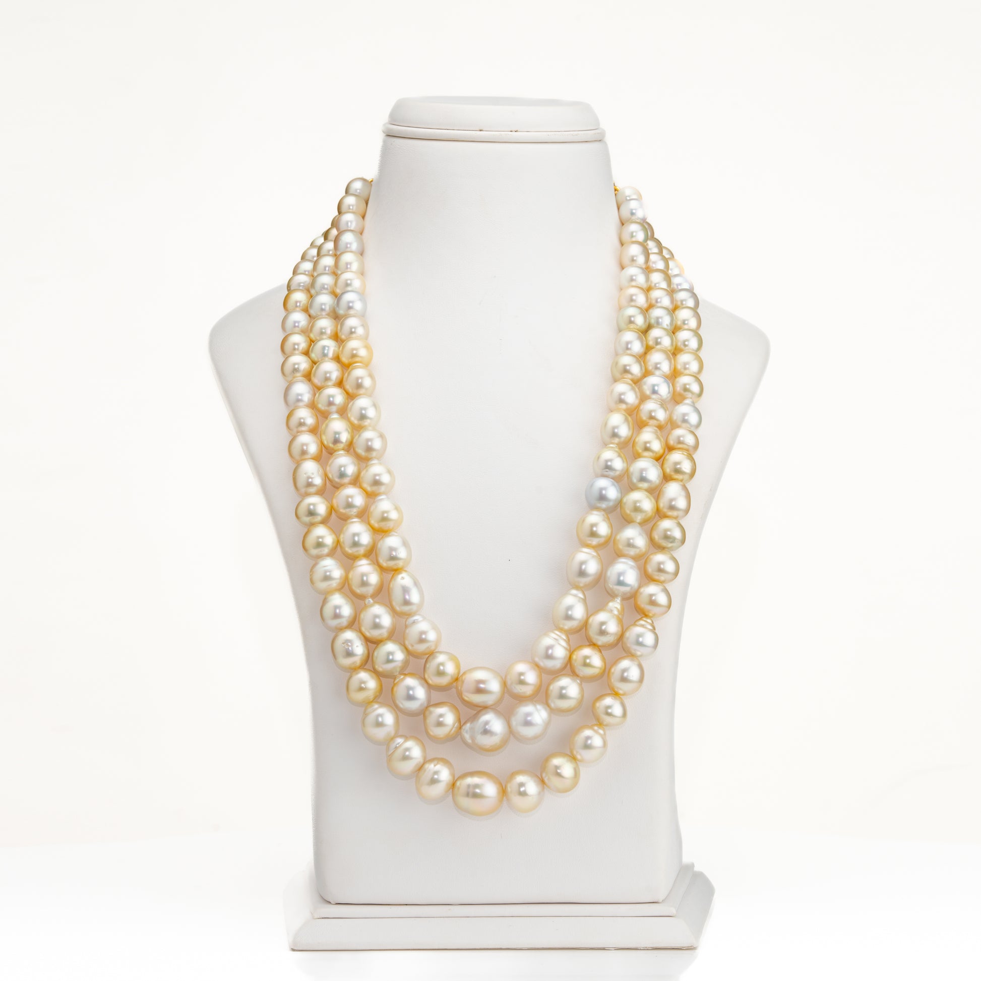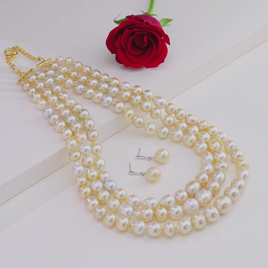 This luxurious necklace set features exquisite 12–13mm cream drop South Sea pearls, known for their radiant luster and natural elegance. Crafted in a grand three-row, 18-inch design, it showcases A-quality saltwater cultured pearls with an impressive weight of approximately 1196.85 carats. Each piece includes a Life Long Guarantee on Pearls and a Certificate of Authenticity, ensuring 100% genuine pearls.