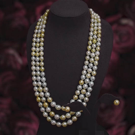 Make a bold statement with this luxurious South Sea Saltwater Cultured Pearl necklace . Featuring three rows of perfectly round, cream-colored A-grade pearls sized 12–13 mm, this 18-inch masterpiece weighs approximately 2062 grams. Backed by a lifelong guarantee and a Certificate of Authenticity, it's crafted for those who value elegance and authenticity. Ideal for grand events, bridal wear, or upscale traditional outfits, this opulent piece enhances both classic and contemporary wardrobes with unmatched sophistication.