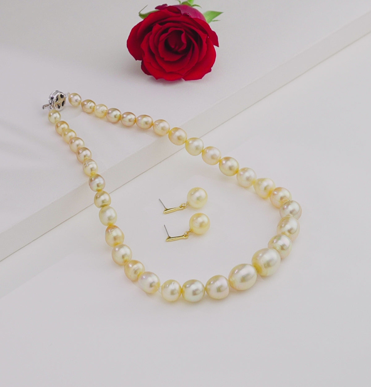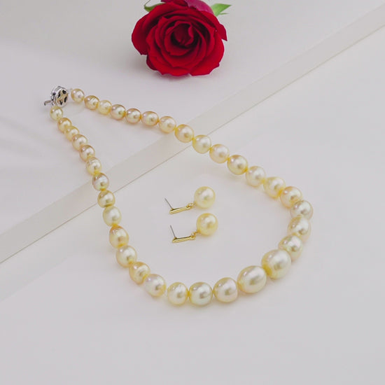 This luxurious necklace set features stunning 13–14mm golden drop-shaped South Sea pearls, admired for their rich hue and radiant natural luster. Designed in an elegant single-row, 16-inch layout, it showcases A-quality saltwater cultured pearls weighing approximately 398.95 carats, offering exceptional beauty and refined sophistication. Each pearl is hand-selected for its glow, smooth surface, and graceful silhouette. The set includes a Life Long Guarantee on Pearls and a Certificate of Authenticity, assuring 100% genuine quality.