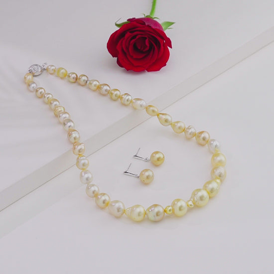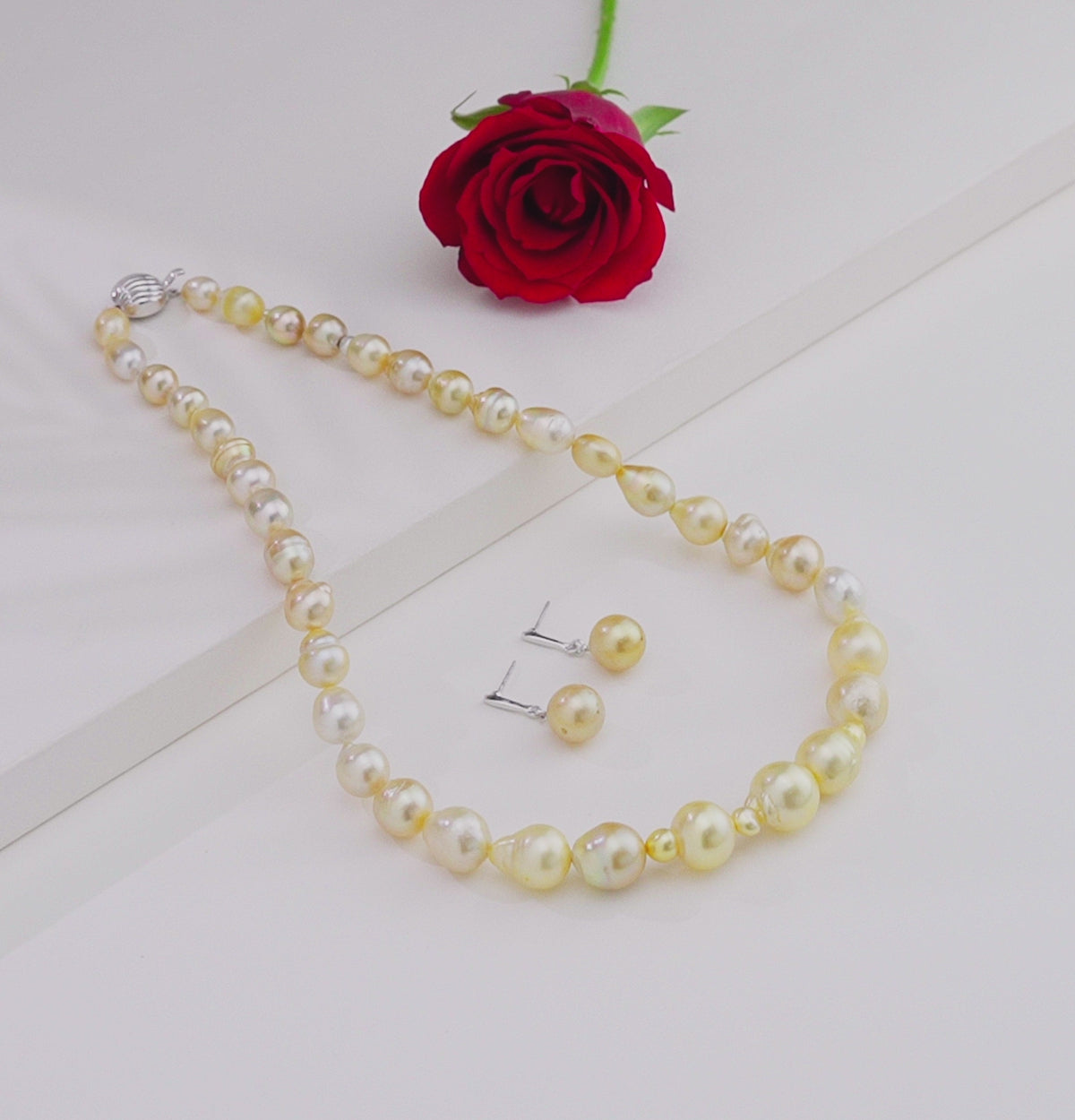 This striking necklace set showcases rare 14–15mm cream Baroque South Sea pearls, prized for their organic shapes and rich, natural luster. Designed in a refined single-row, 18-inch style, it highlights the bold elegance and individuality of each pearl. With an approximate pearl weight of 401 carats, this A-quality set offers exceptional presence and timeless appeal. It includes a Life Long Guarantee on Pearls and a Certificate of Authenticity, ensuring 100% genuine pearls.