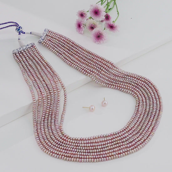 This graceful necklace set features 3.0-4.0mm pink button freshwater cultured pearls of AA quality, beautifully arranged in 8 elegant rows. At 18 inches in length and weighing approximately 114.800 grams, it offers a rich, layered look with a soft pink glow that enhances feminine charm. Backed by a lifelong guarantee on pearls, this exquisite piece is perfect for weddings, festive occasions, or as a statement accessory to elevate both ethnic and contemporary attire.