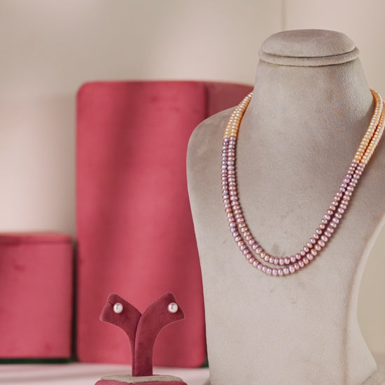 Elevate your elegance with this exquisite necklace, crafted from premium freshwater cultured pearls in a unique button shape. Featuring multicolor pearls of 4-5mm size and A-grade quality, this 18-inch piece showcases two stunning rows of radiance. Weighing approximately 52.1 grams, it’s a blend of beauty and durability, backed by a life-long guarantee on pearls.