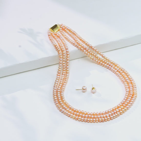 Elegant and feminine, this freshwater cultured pearl necklace . features three delicate rows of soft pink, button-shaped pearls sized 4–5 mm. Crafted with 'A' grade quality and weighing approximately 72.9 grams, this 18-inch necklace offers refined beauty with a lifelong guarantee on pearls—ensuring both grace and durability in every wear.