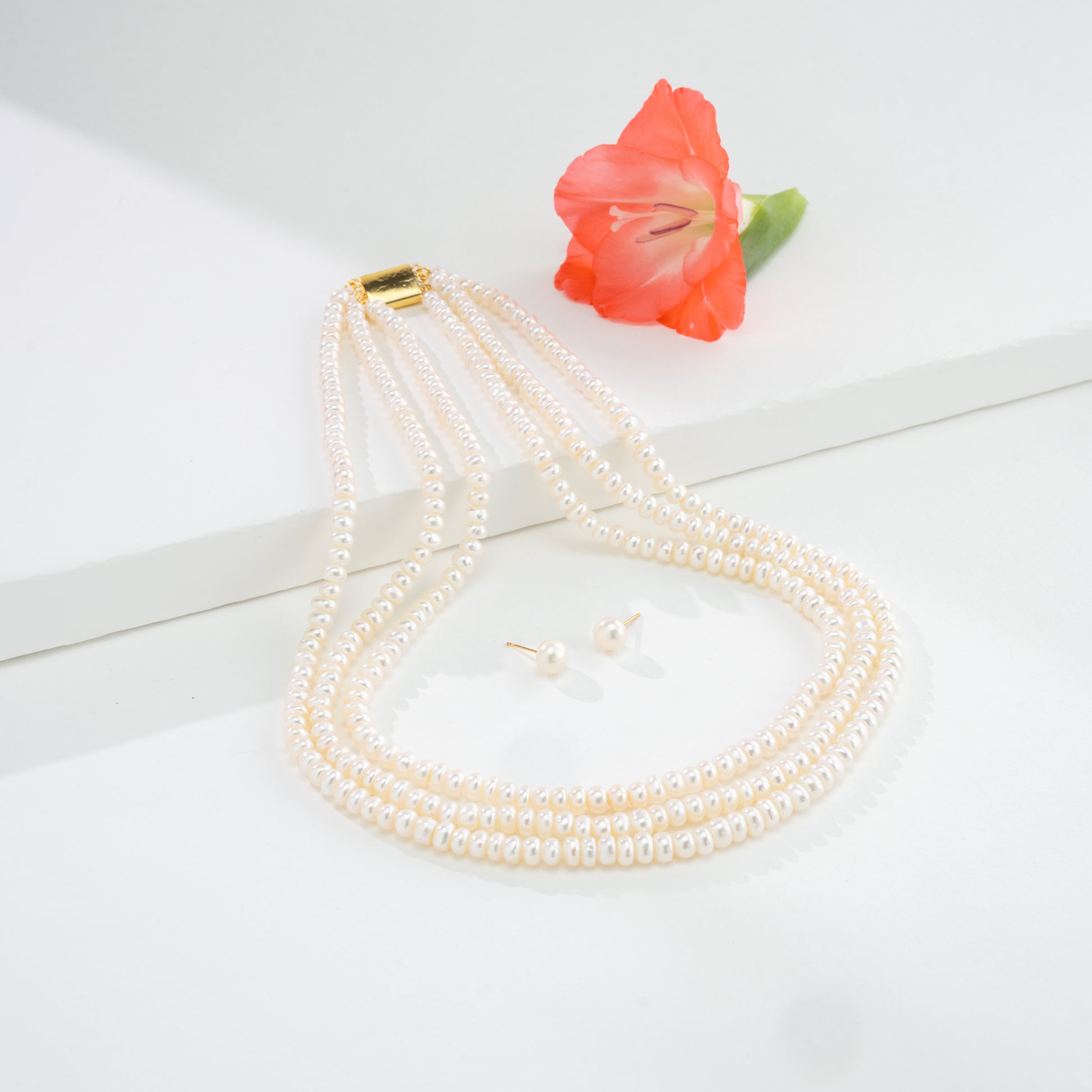 Charming and versatile, this three-row freshwater cultured pearl necklace is crafted with elegant button-shaped pearls measuring 4.0-5.0mm. The luminous white pearls create a graceful layered look, with a total weight of approximately 78.6 grams, offering both beauty and substance. Designed at an 18-inch length, it drapes perfectly to complement both modern and traditional styles. With its refined appeal and life-long guarantee on pearls, this necklace is ideal for weddings, festive occasions, or elevating everyday elegance.