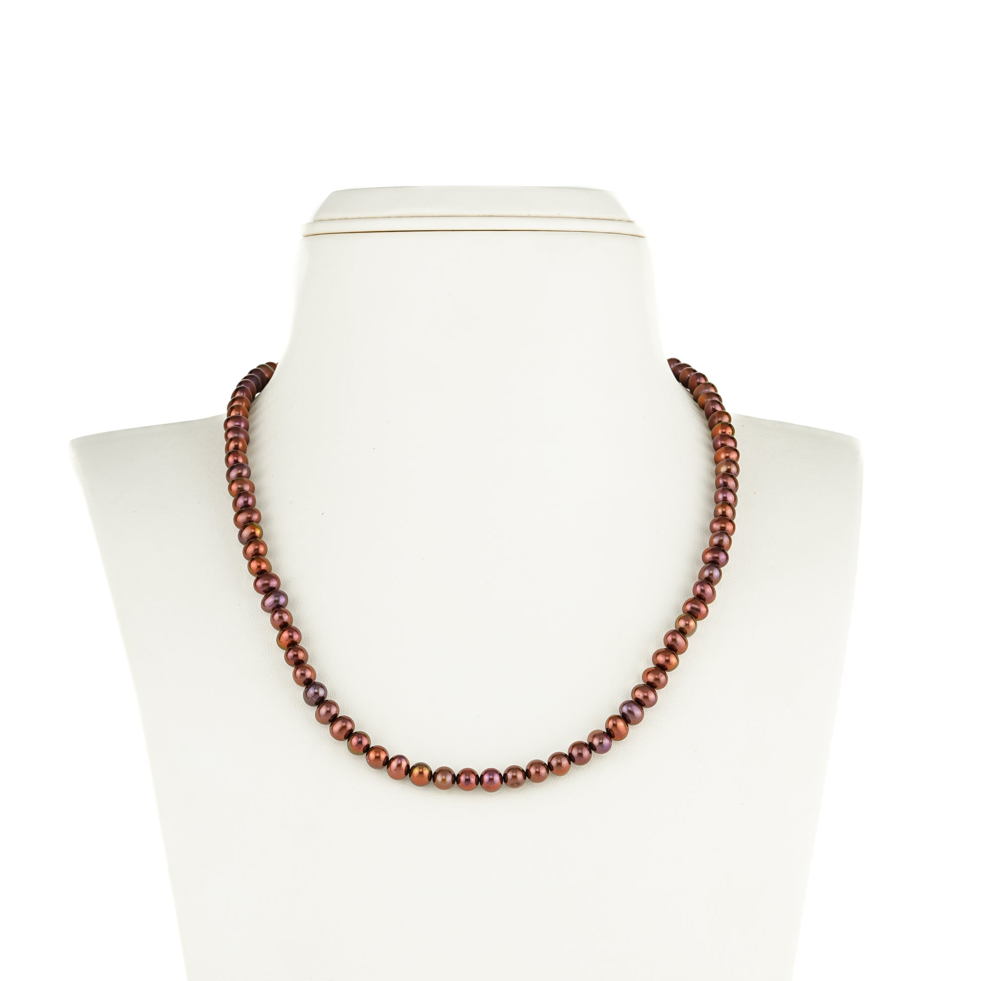 Make a bold style statement with this single-row freshwater cultured pearl necklace, featuring near round pearls sized 5.0-6.0mm in a rich bronze hue. With an approximate weight of 28.500 grams and a longer 20-inch length, it offers both elegance and comfort, draping beautifully for any occasion. The warm bronze tone adds a unique contemporary touch, making it stand out from traditional white pearls. Backed by a life-long guarantee on pearls, this necklace is perfect for festive wear, evening ensembles, or enhancing your modern jewelry collection.