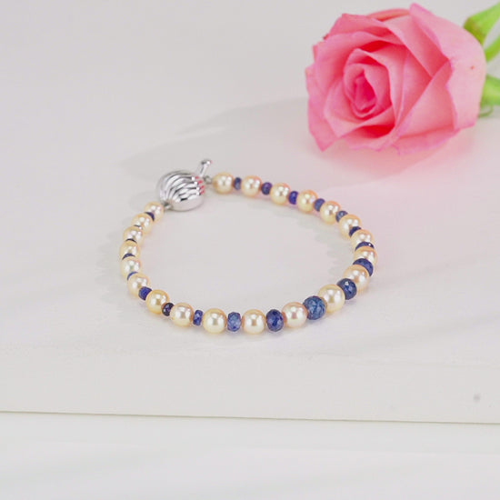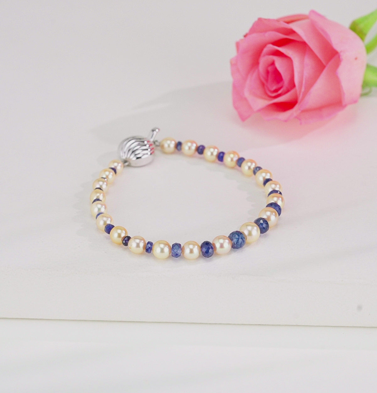 5.0-6.0mm Natural Sapphire And Golden Akoya Saltwater Pearl Bracelet - AA Quality