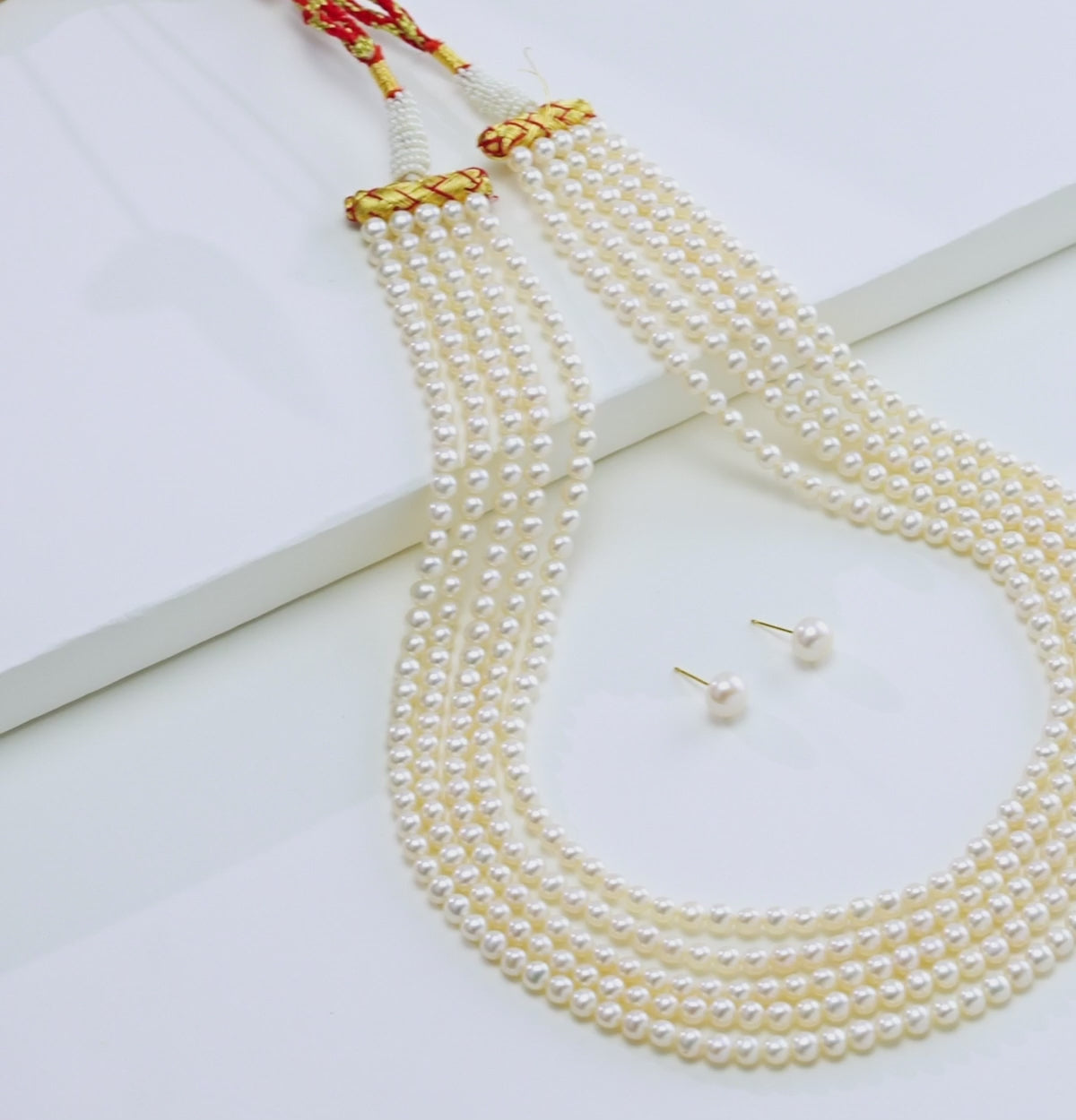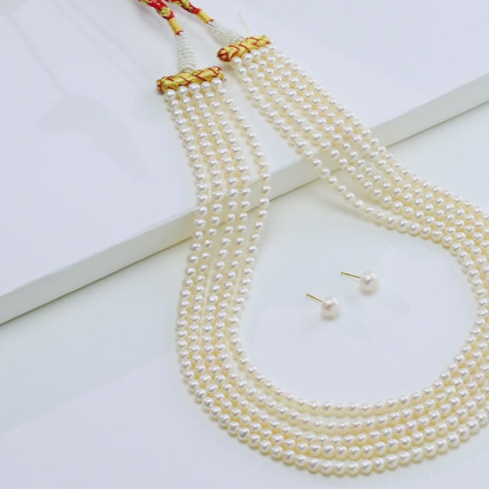 Elevate your elegance with this luxurious freshwater cultured pearl necklace set, crafted with AAA-quality button fancy pearls. Featuring five radiant rows of white pearls sized 5–6 MM, this 18-inch masterpiece weighs approximately 99.4 grams, showcasing both beauty and substance. The fine luster and uniformity of pearls reflect premium craftsmanship, making it a timeless treasure. Backed by a life-long guarantee, this necklace set is perfect for weddings, festive occasions, and grand celebrations, adding unmatched sophistication to both traditional and modern attire.