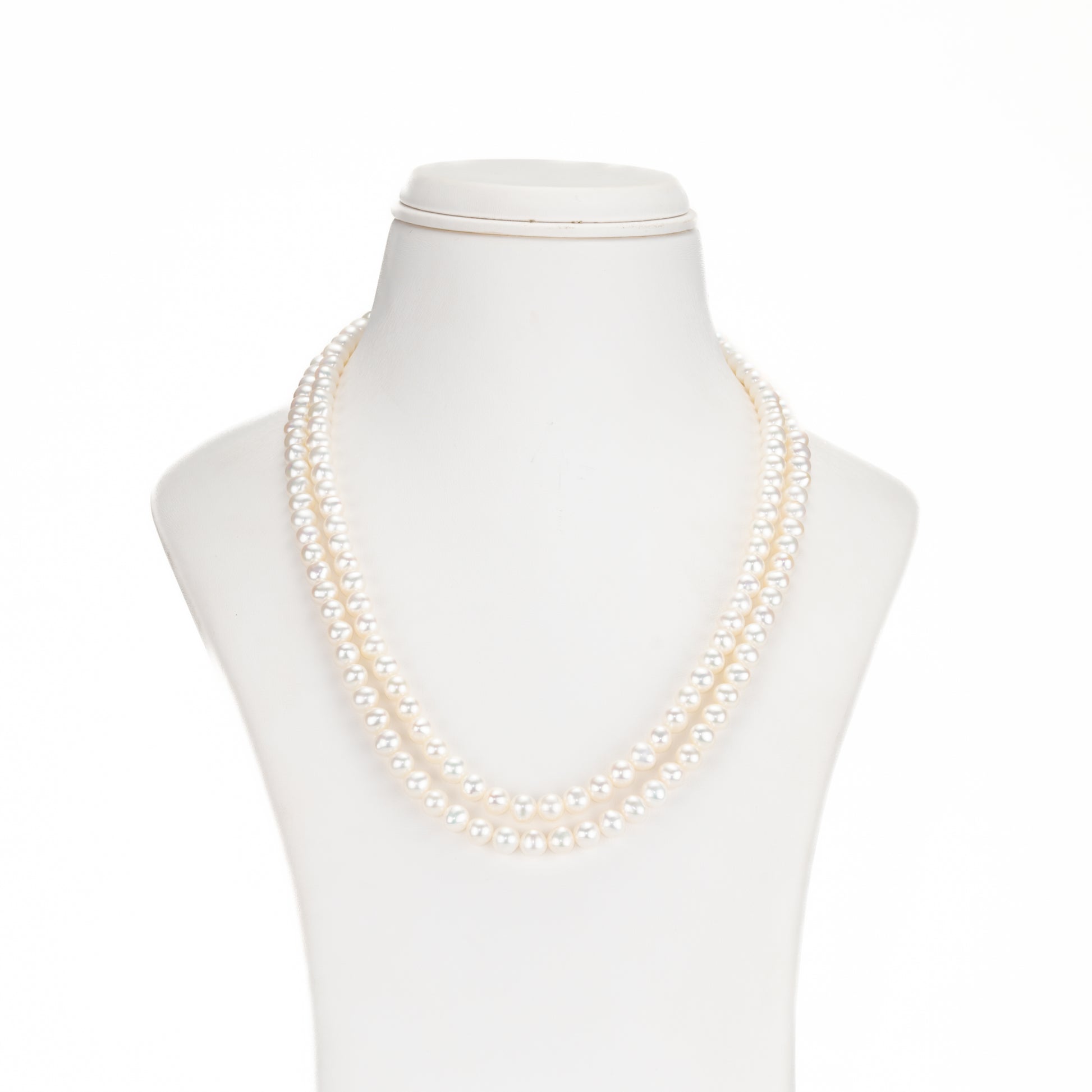 Timeless and elegant, this 2-row freshwater cultured pearl necklace.features classic round white pearls sized 6–7 mm. With AA-grade quality and weighing approximately 53.700grams, its 18-inch length is designed to sit gracefully along the neckline. The pristine luster and balanced craftsmanship make it a sophisticated choice, while a lifelong guarantee ensures enduring value and beauty. Perfect for weddings, anniversary dinners, or religious functions, this necklace beautifully complements sarees, formal blouses, or evening gowns—offering a refined finishing touch to both traditional and modern outfits.