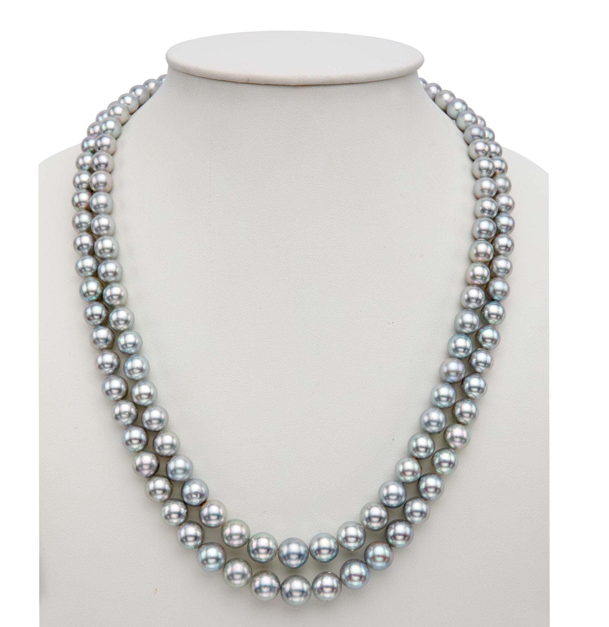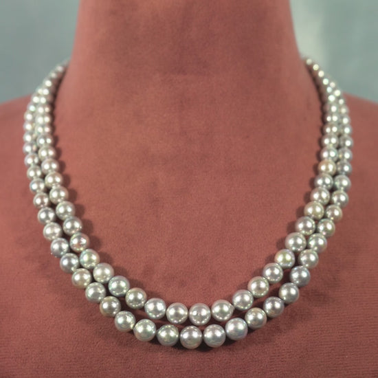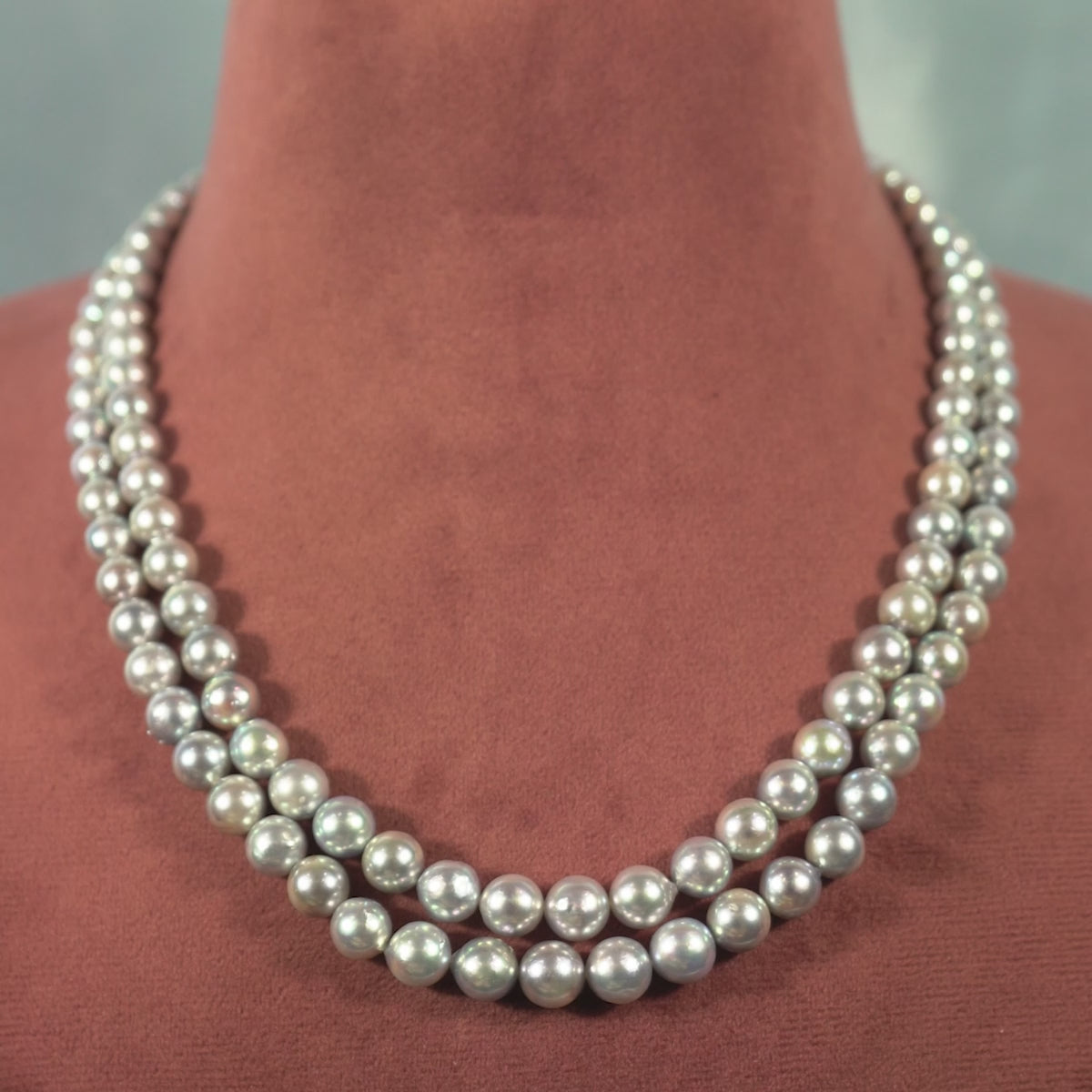 Discover refined elegance with our Grey Akoya Pearl Necklace, crafted from premium saltwater cultured pearls. Featuring AAA-grade round pearls in a chic grey tone, this 18-inch necklace boasts 2 graceful rows of 6–9 mm pearls with a total weight of approximately 378.95 ct. Certified for authenticity and backed by a lifelong pearl guarantee, it promises timeless beauty and trust.