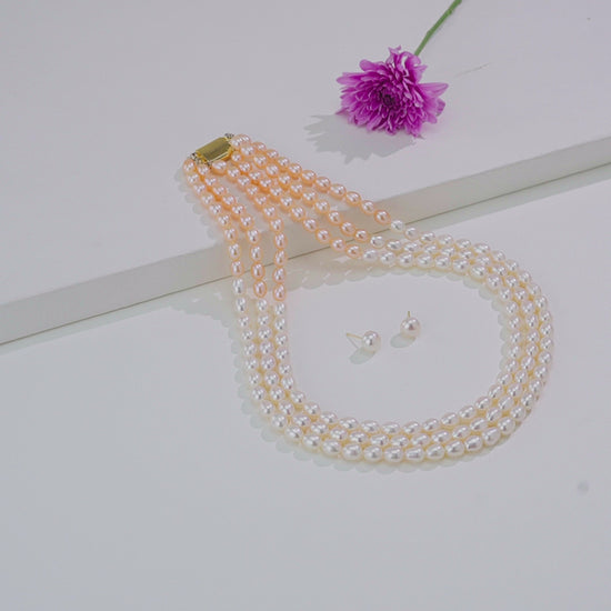 This elegant 7.0–8.0 mm Multicolor Drop Freshwater Pearl Necklace Set is crafted with premium A-grade freshwater cultured pearls. Featuring beautifully shaped drop pearls in natural multicolor tones, the necklace is designed in a luxurious three-row style that adds depth and sophistication. Measuring 18 inches in length, it sits gracefully on the neckline, making it perfect for weddings, festive occasions, and formal wear. The pearls have a combined approximate weight of 86.10 grams, offering a rich and substantial feel. This timeless necklace set comes with a lifetime guarantee on pearls, ensuring lasting beauty, quality, and confidence in your purchase.