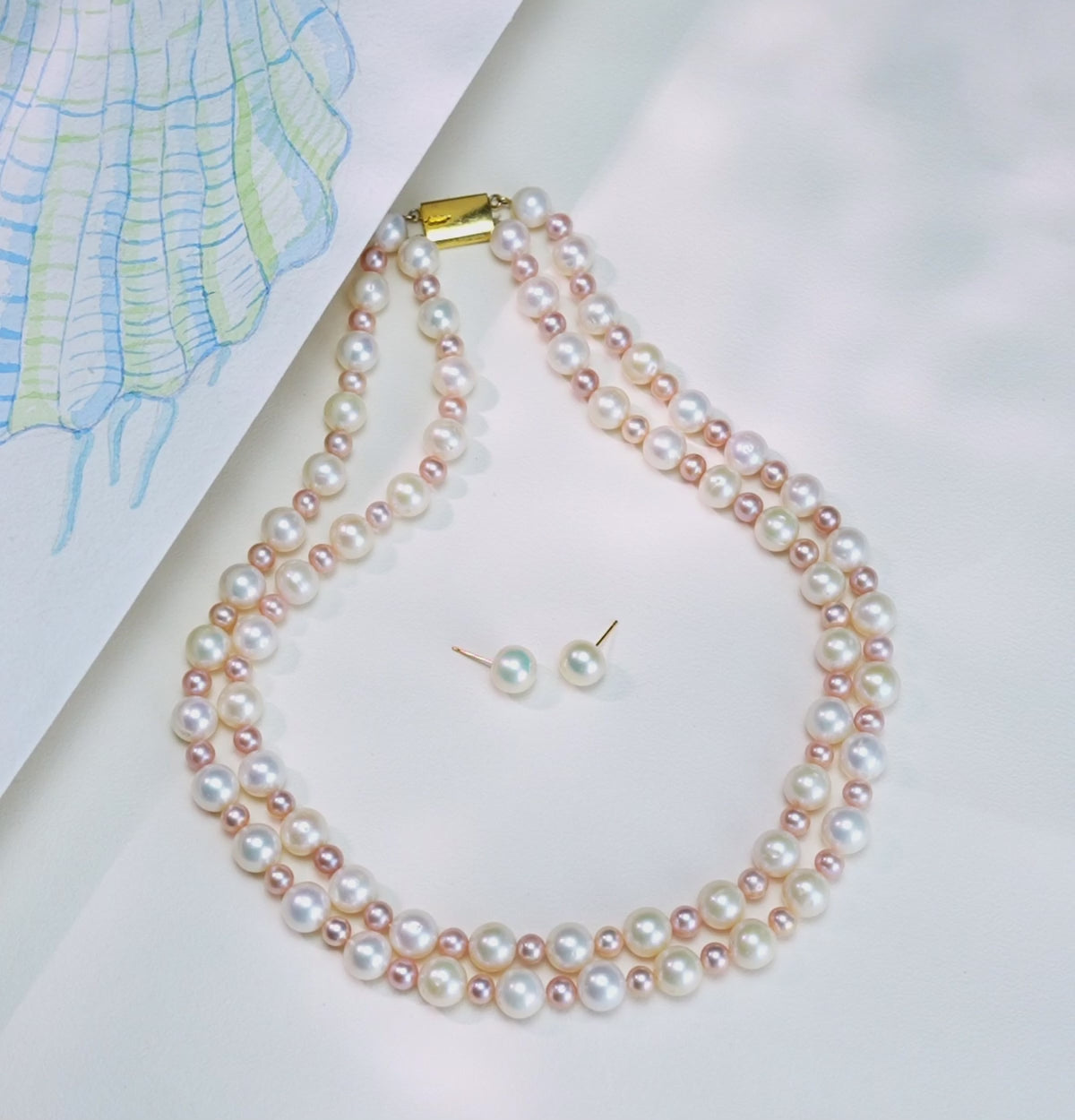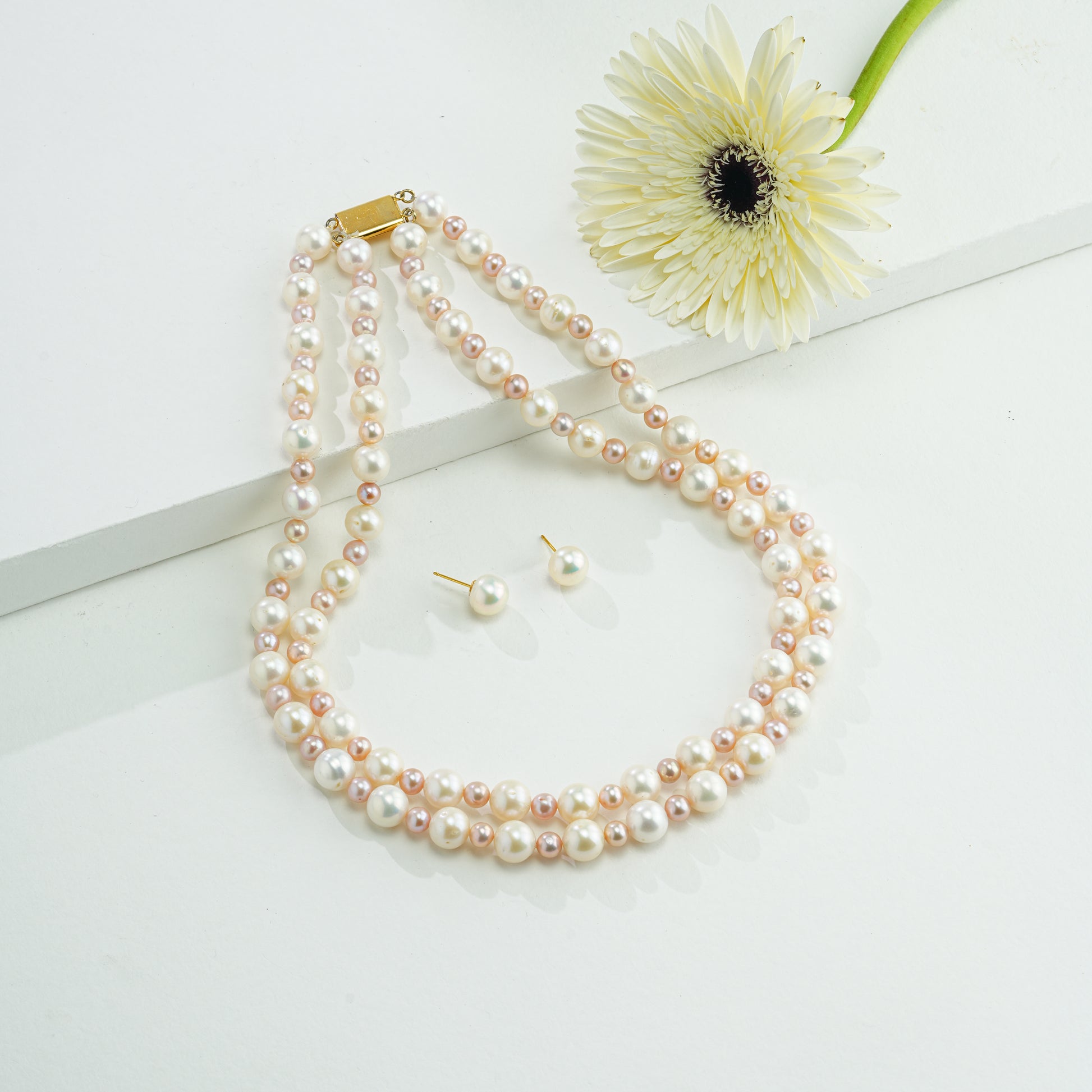 Elevate your elegance with our exquisite Freshwater Cultured Pearl Necklace. This stunning piece features two rows of perfectly round, multicolored pearls, each 9-10mm in size with an AA quality rating. Approximately weighing 101.2 grams and measuring 18 inches, it comes with a life-long guarantee. This versatile necklace is perfect for adding a touch of sophistication to any outfit, ideal for both formal events and special celebrations.