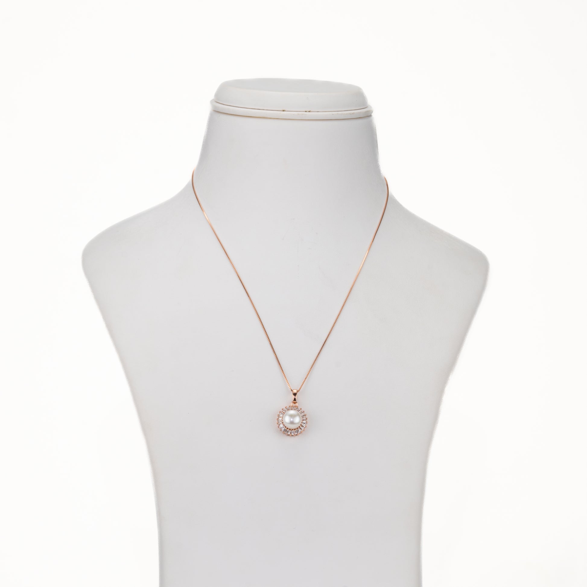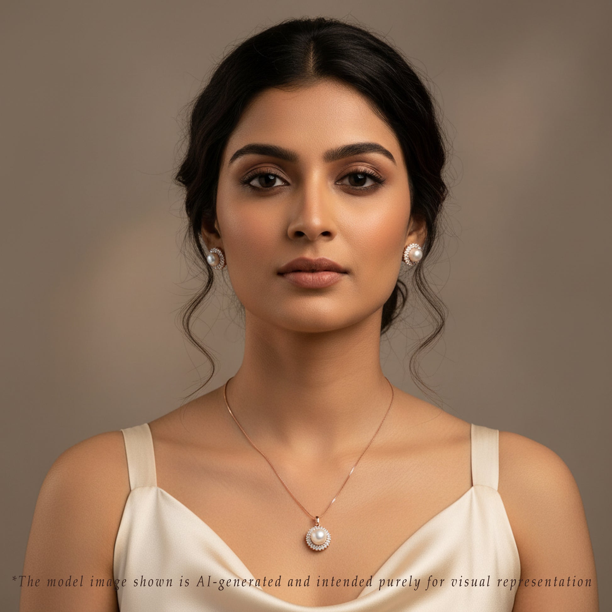 Elegant and timeless, the Rose Gold Silver Freshwater Pearl Necklace Set (ADSPL1) features lustrous 8–9 mm freshwater cultured pearls in a smooth button shape. The radiant white pearls are set on a refined 92.5 sterling silver base finished with a warm rose gold polish, giving the piece a modern yet classic appeal. Designed in a single-row, 16-inch style, it sits beautifully along the neckline, perfect for both daily wear and special occasions. With a soft, feminine glow and enduring craftsmanship, this necklace set includes a Life Long Guarantee on Pearls, ensuring lasting beauty and value.