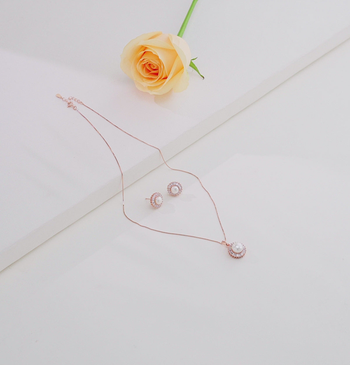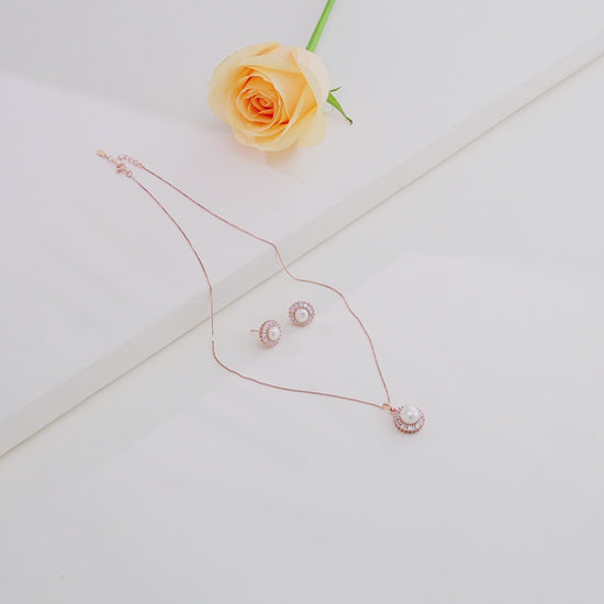 Charming Silver Rose Gold Freshwater Pearl Necklace Set
