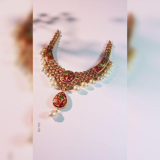 Enquire Now On WhatsAppRadiate timeless beauty with our Alluring Kundan Gold Necklace, an exquisite creation that showcases the brilliance of kundan artistry set in radiant gold. Crafted with precision, this necklace reflects regal elegance and traditional charm. The intricate detailing and luxurious finish highlight its unmatched craftsmanship, making it a treasured addition to any jewelry collection. Its enchanting design brings together cultural heritage and modern sophistication, creating a piece that truly stands out.