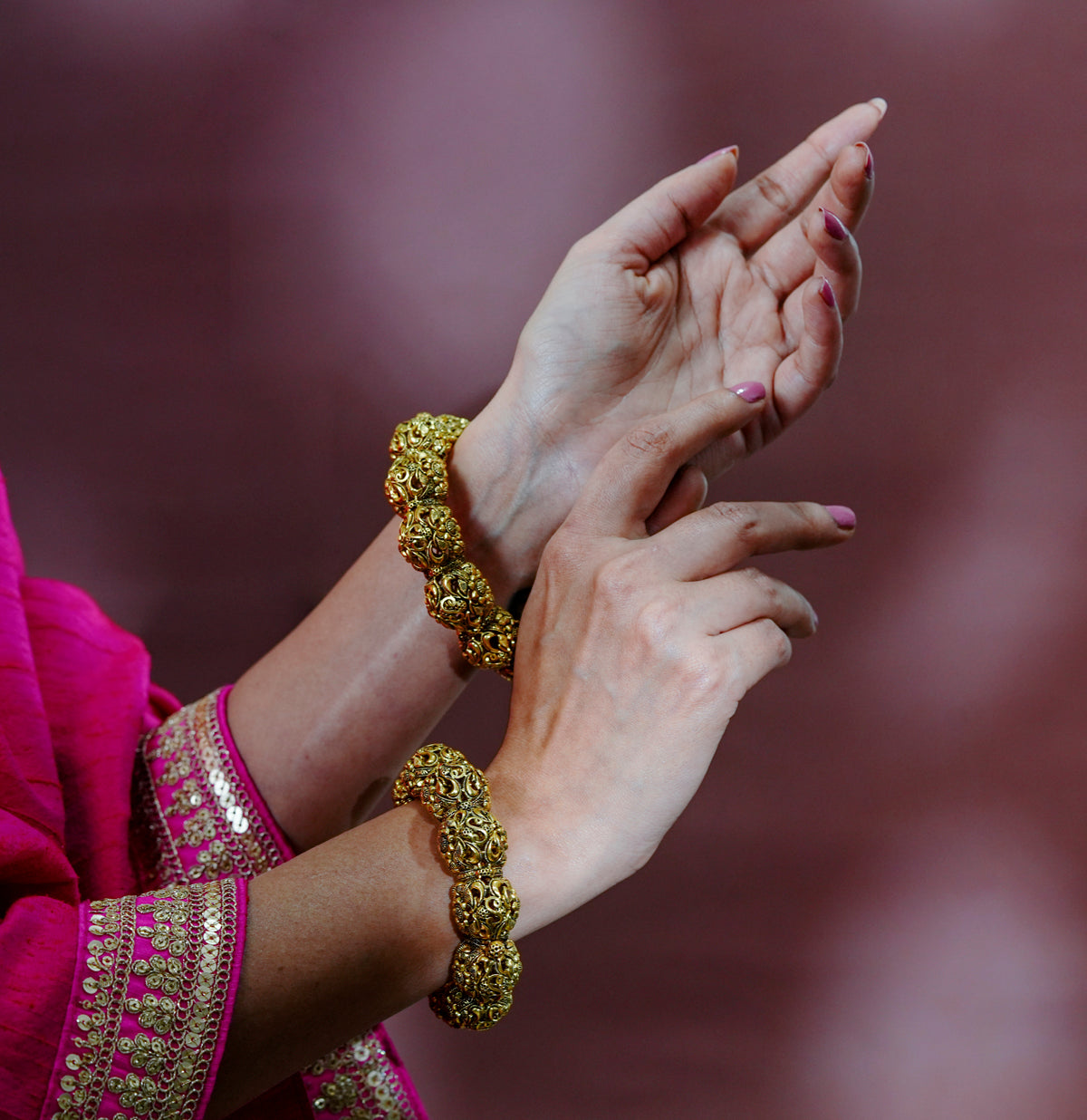 Enquire Now On WhatsAppExquisite and timeless, this Antique Finish Naskhi Bangle is a masterpiece of traditional craftsmanship. Handcrafted with intricate Naskhi work, the bangle showcases a stunning blend of floral and divine motifs, giving it a rich, vintage appeal. Made from high-quality metal with an antique gold finish, it provides a look of elegance and grandeur. This piece is perfect for adding a touch of classic charm to your ethnic wardrobe. Pair it with a saree, lehenga, or traditional gown for weddings, festivals, and special celebrations.