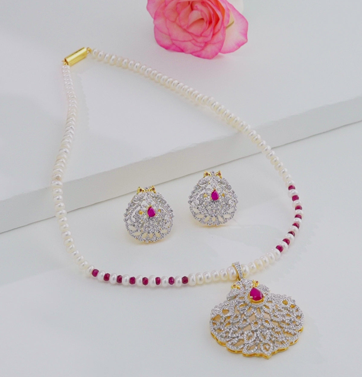 Elevate your elegance with this graceful necklace set, crafted from lustrous white button-shaped freshwater cultured pearls (3–4 mm) of A-grade quality. The 16-inch single-row design features a striking natural ruby-red pendant, creating a perfect harmony of classic pearls and vibrant gemstone allure. Backed by a life-long guarantee on pearls, this timeless piece is ideal for weddings, festive occasions, and sophisticated evening wear, adding charm to both traditional and modern attire.