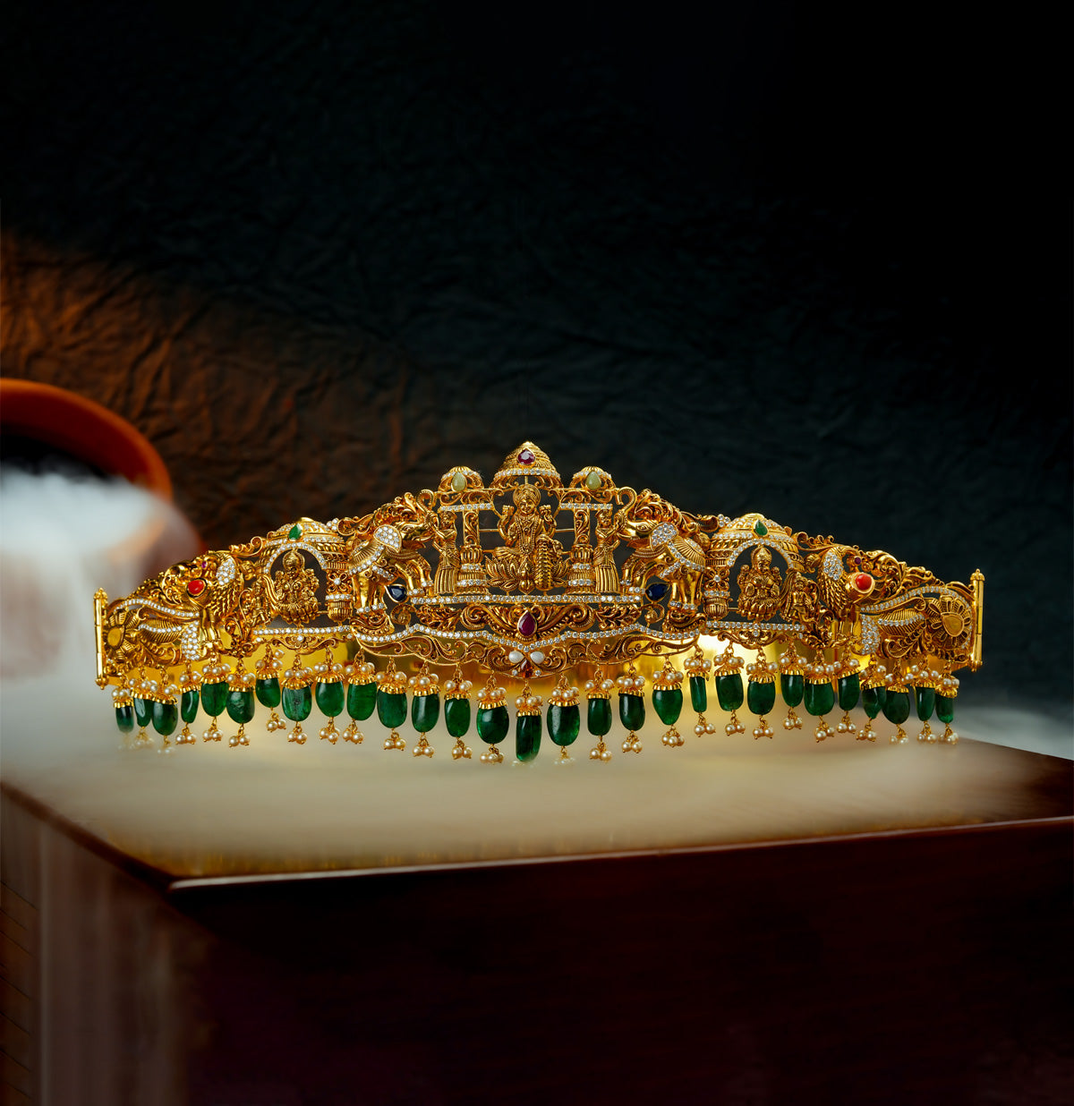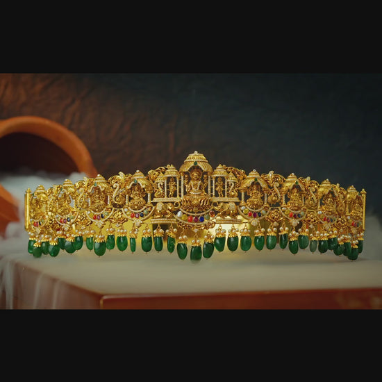 Enquire Now On WhatsAppCelebrate tradition and grace with this Beautiful Gold Lakshmi Devi Vaddanam, exquisitely crafted with intricate artistry and divine detailing. Featuring the sacred Lakshmi Devi motif, it symbolizes prosperity, blessings, and cultural heritage. The radiant gold finish and flawless craftsmanship make it a timeless jewel, perfect to be cherished as an heirloom. Designed to reflect elegance and spirituality, it adds grandeur and sophistication to every occasion. Ideal for weddings, religious ceremonies, and festive gatherings, this vaddanam pairs beautifully with bridal attire, silk sarees, and ethnic ensembles, enhancing your look with regal elegance and divine charm.