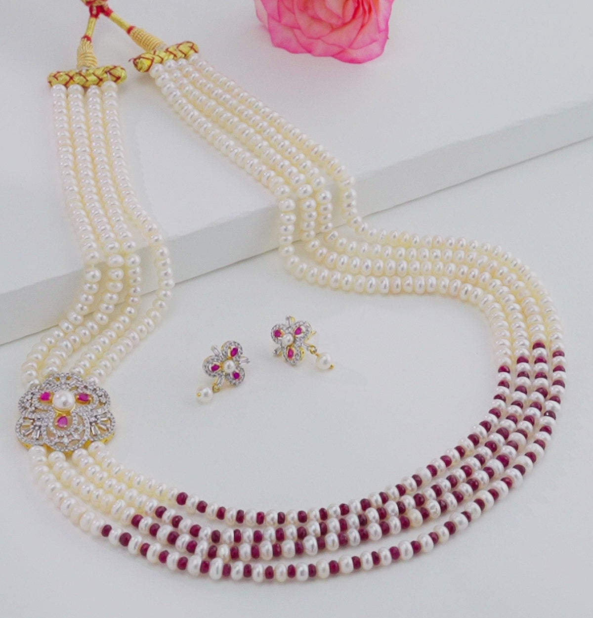 Make an unforgettable statement with this exquisite necklace set, featuring lustrous white freshwater cultured pearls in an elegant button shape (AA-grade quality). The four-row, 20-inch design exudes luxury, while the side piece is adorned with a striking natural ruby-red stone, adding a regal touch to your ensemble. Backed by a life-long guarantee on pearls, this masterpiece pairs beautifully with traditional attire, festive wear, and formal gatherings, elevating your style with timeless grace.