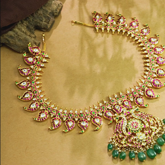 Enquire Now On WhatsAppCelebrate heritage with our Captivating Kundan Mango Necklace, a stunning creation that beautifully blends tradition and artistry. Featuring intricate kundan work and the iconic mango motifs, this necklace symbolizes prosperity, elegance, and cultural richness. The radiant kundan stones sparkle with timeless charm, while the detailed craftsmanship adds a regal touch to its design. A true heirloom piece, it reflects both devotion and grandeur, making it a treasured addition to any collection.