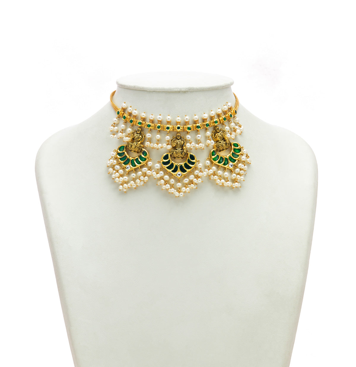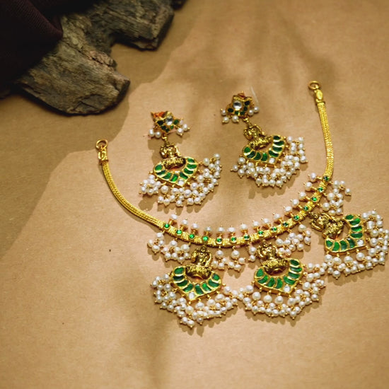Enquire Now On WhatsAppRadiate elegance with our Charming Kundan Gutta Pusalu Necklace Set, a captivating blend of traditional artistry and timeless beauty. Adorned with luminous kundan stones and cascading guttapusalu pearls, this set reflects regal charm and cultural richness. The intricate craftsmanship and graceful detailing highlight its heritage-inspired design, making it a true heirloom piece. Complete with matching earrings, it offers a harmonious balance of devotion, luxury, and sophistication. Perfect for women who adore classic tradition, it embodies both grace and grandeur.
