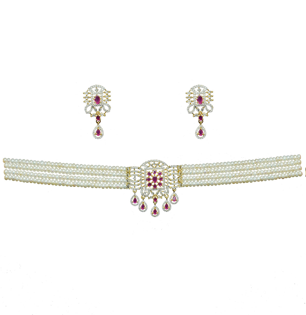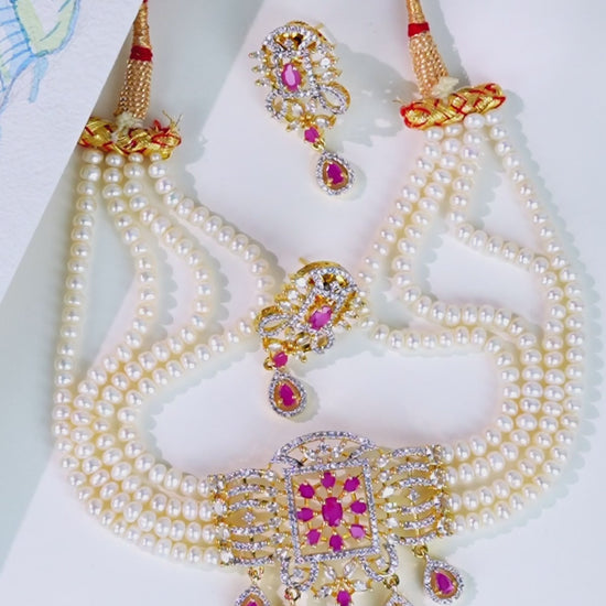 Make a bold statement with this 10-inch choker, intricately crafted with four rows of 3–4mm A-grade freshwater cultured pearls in a refined button shape. The pristine white pearls are enhanced by a vibrant red stone centerpiece, offering a striking contrast and luxurious appeal. Designed for durability and elegance, it comes with a lifelong guarantee on pearls. This timeless choker adds charm to ethnic outfits and modern silhouettes alike—perfect for weddings, festive gatherings, or upscale evening events where style and grace matter most.