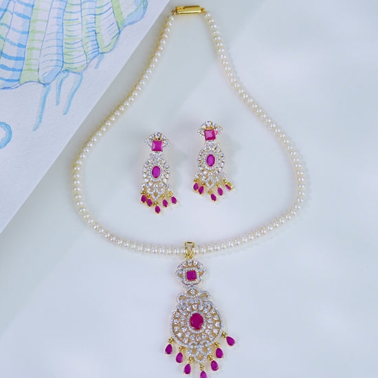 Crafted with elegance, this necklace features 3-4MM white button freshwater cultured pearls of A quality, arranged in a single 16-inch strand. The design is elevated with a vibrant red stone pendant, creating a graceful balance between subtlety and charm. Backed by a life-long guarantee on pearls, it promises lasting beauty and value. Perfect for daily wear, festive gatherings, or as a thoughtful gift, this piece complements both modern and traditional attire effortlessly.