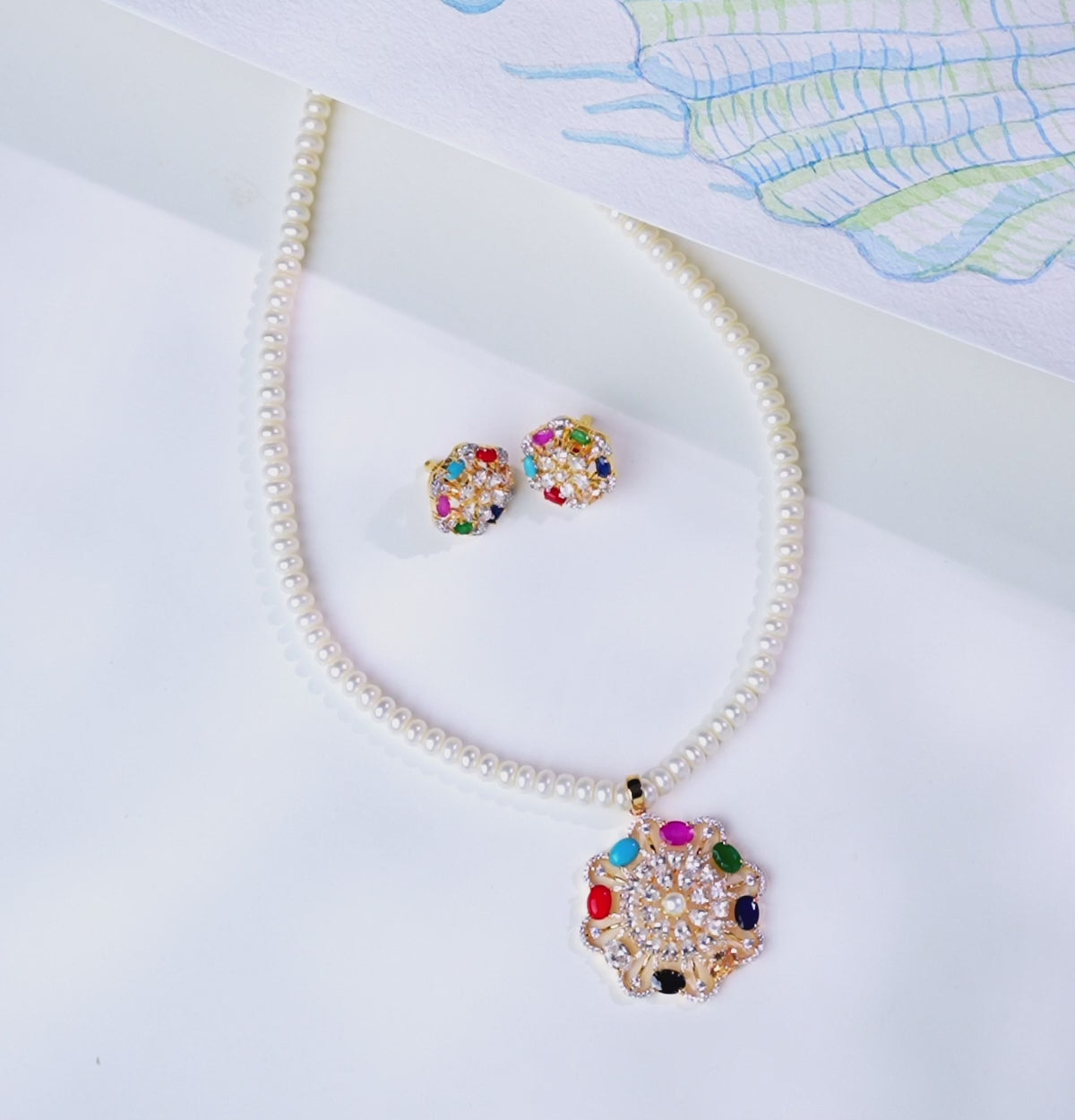 Dainty Navratna Multicolor Freshwater Pearl Necklace Set