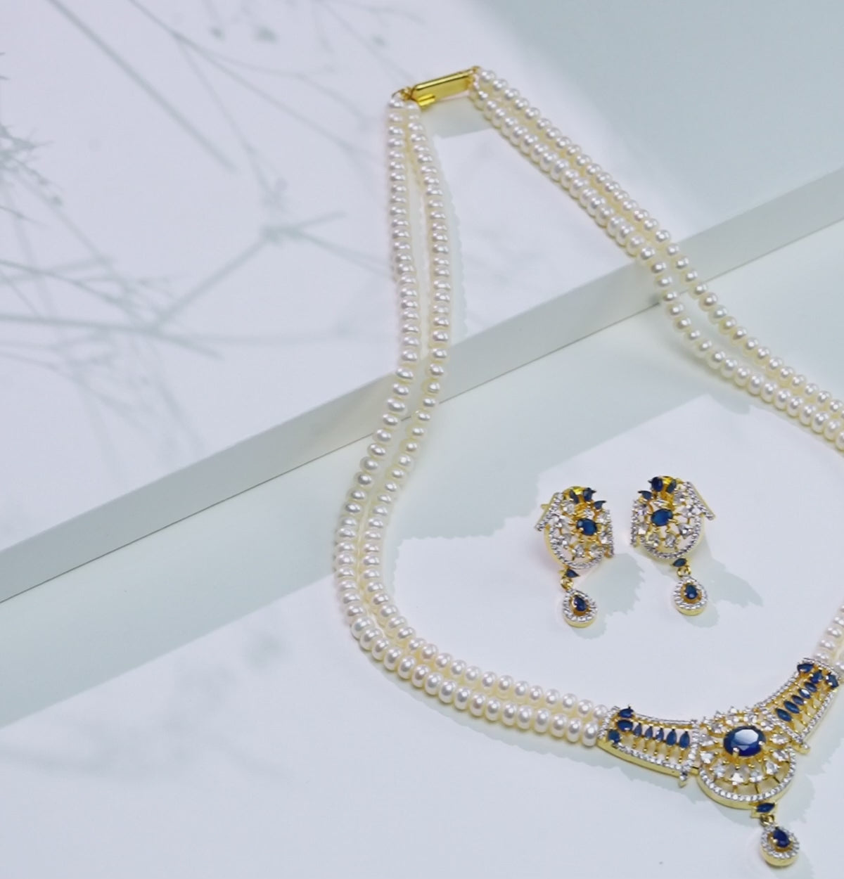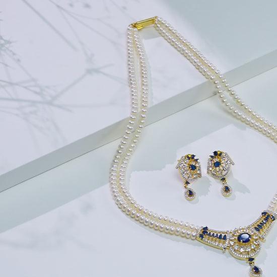 Grace your neckline with the Freshwater Cultured Pearl necklace, showcasing radiant white button pearls sized 3–4mm in a graceful double-row, 18-inch design. Accented with a vibrant blue stone set in an elegant U-shape pendant, this A quality pearl piece is a symbol of timeless sophistication and is backed by a lifelong pearl guarantee. Ideal for festive occasions, formal events, or pairing with sarees, gowns, or Indo-western attire to add a touch of refined charm and elegance.