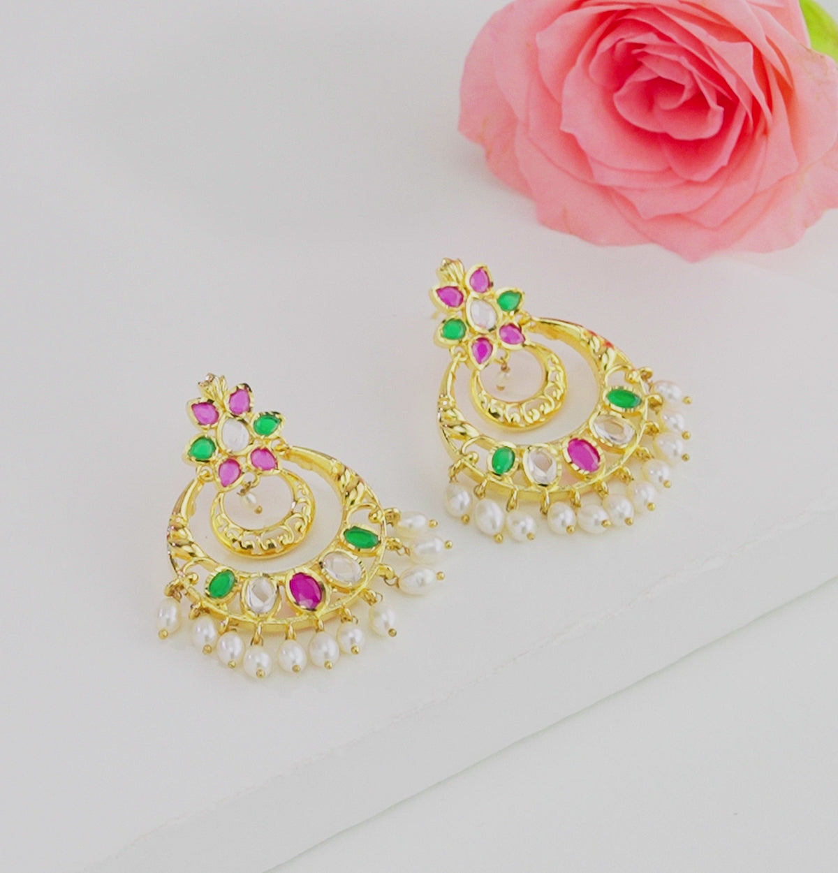 Designer Multi Color Chand Bali with Pearl Drop is a stunning blend of tradition and elegance. Adorned with Freshwater Cultured Pearls of A-grade quality, it features delicate white drop-shaped pearls sized 5-6 MM. The multi-color detailing enhances its charm, while the lifelong guarantee on pearls ensures everlasting beauty and trust. This exquisite design combines cultural richness with contemporary appeal, making it a timeless piece for your collection. Perfect for weddings, festive occasions, cultural celebrations, or parties, it pairs beautifully with traditional attire, adding grace, vibrancy, and sophistication to your overall look.