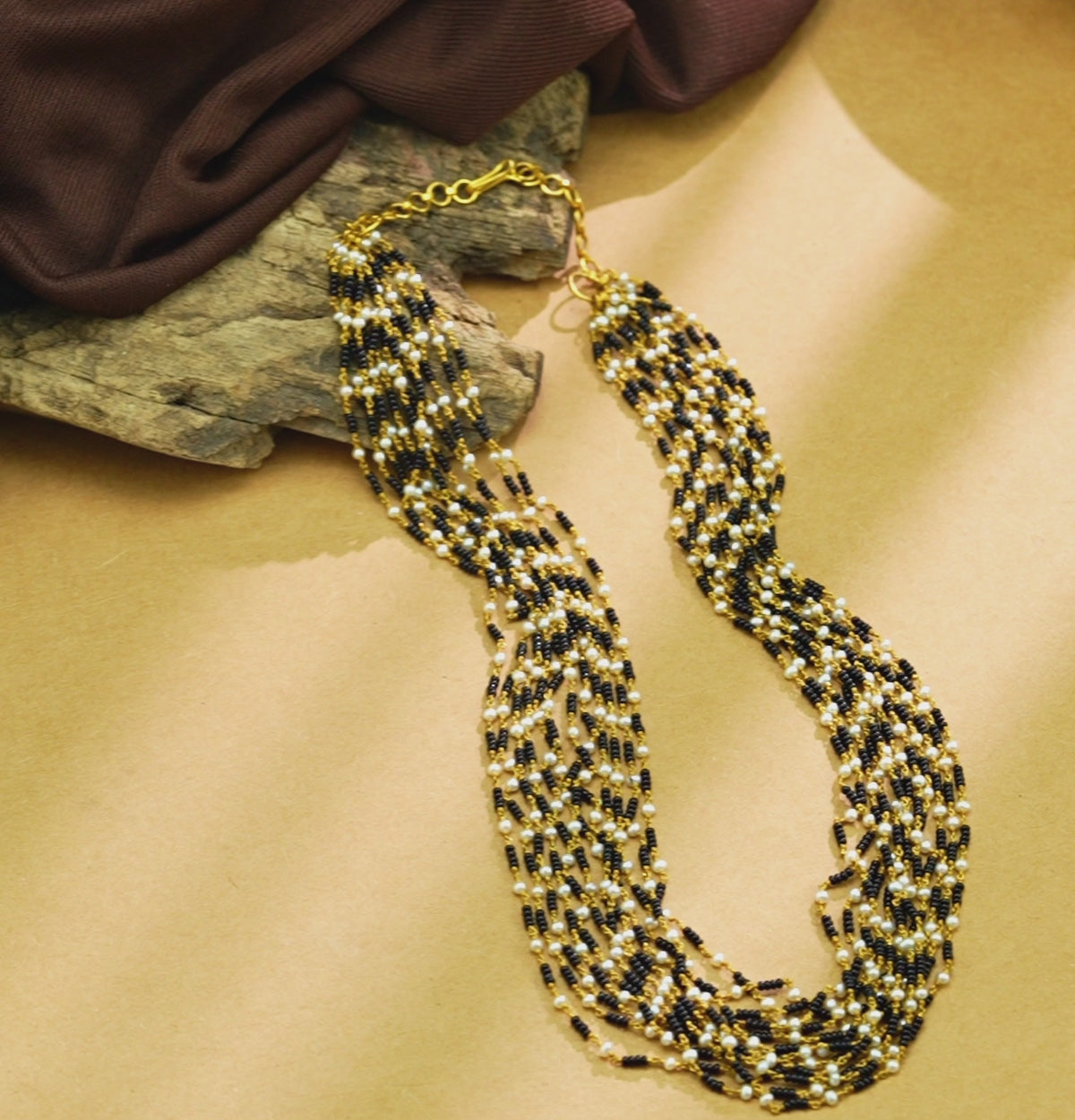 Enquire Now On WhatsAppEmbrace subtle elegance with our Ethereal Black Beads Taar Mala Necklace, a graceful creation that reflects simplicity and timeless charm. Crafted with delicate black beads strung in fine taar, this necklace embodies purity, tradition, and understated beauty. Its lightweight design and refined detailing make it perfect for everyday elegance as well as special occasions. The craftsmanship highlights cultural essence, making it a treasured addition to your jewelry collection.