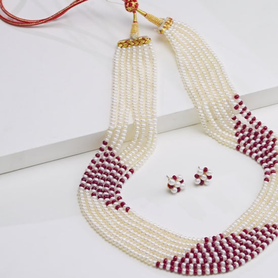 Make an opulent statement with this grand 7-row necklace featuring Freshwater Cultured Pearls & Beads. Crafted with 3–4 MM white button pearls of AAA quality, it is beautifully accented by cut-faceted Ruby Mala stones in a rich red tone. Measuring 18 inches in length and weighing approximately 104.3 grams, this striking piece comes with a lifelong guarantee on pearls and natural stones. Ideal for weddings, bridal trousseaus, and festive celebrations, it pairs magnificently with traditional attire, adding depth, color, and grandeur to your look.