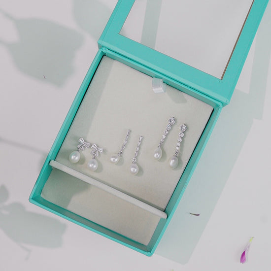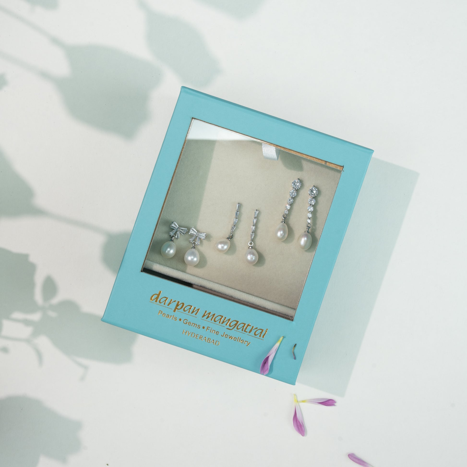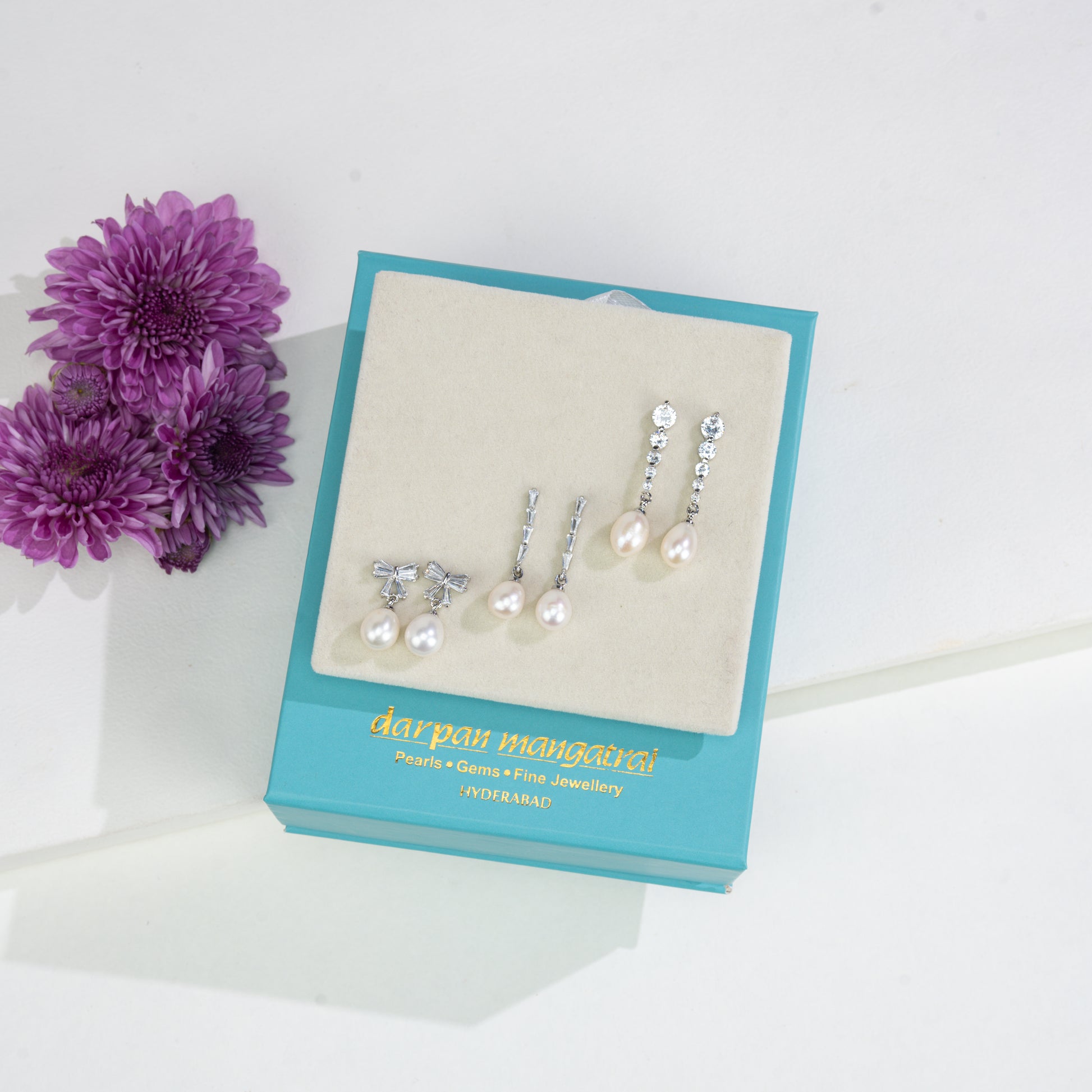 Sparkle Shine Pearl Earring Box brings together classic elegance and radiant charm. Featuring lustrous white freshwater cultured pearls in a graceful drop shape, these earrings highlight refined beauty with a subtle sparkle. The 8–9 MM pearls, selected for their A-grade quality, offer a smooth finish and timeless appeal. Perfect for daily wear or special occasions, this earring box adds effortless sophistication to any look. Finished with a Lifetime Guarantee on Pearls, Sparkle Shine promises enduring beauty, quality, and elegance that shines forever.