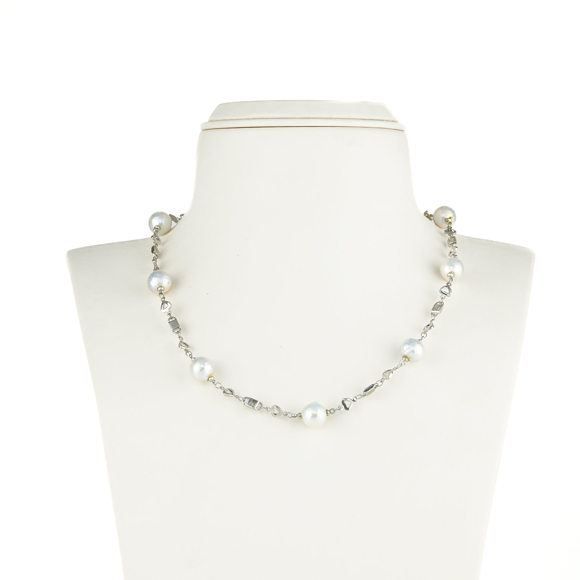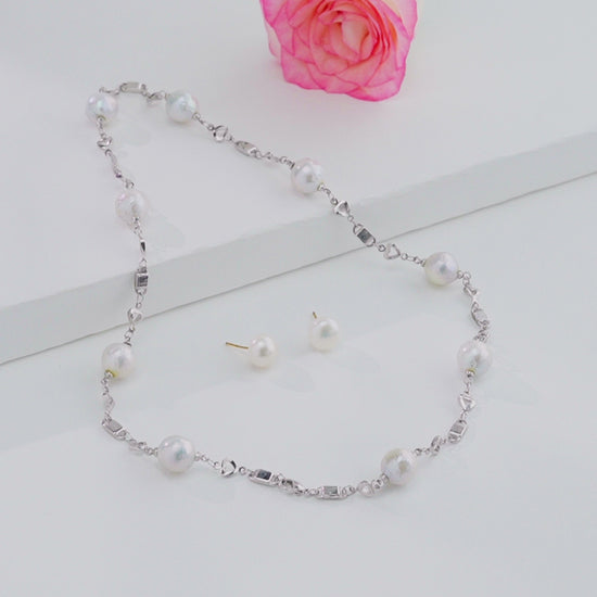 This elegant necklace set features Freshwater Cultured Pearls in a graceful near-round shape. Each 10-11 mm white pearl exudes a natural luster and is graded A quality for its beauty and charm. Designed in a single strand of 20 inches, it carries a timeless appeal, perfect for formal gatherings and special occasions. Backed with a life-long guarantee on pearls, this necklace complements sarees, gowns, and sophisticated evening attire with effortless grace.