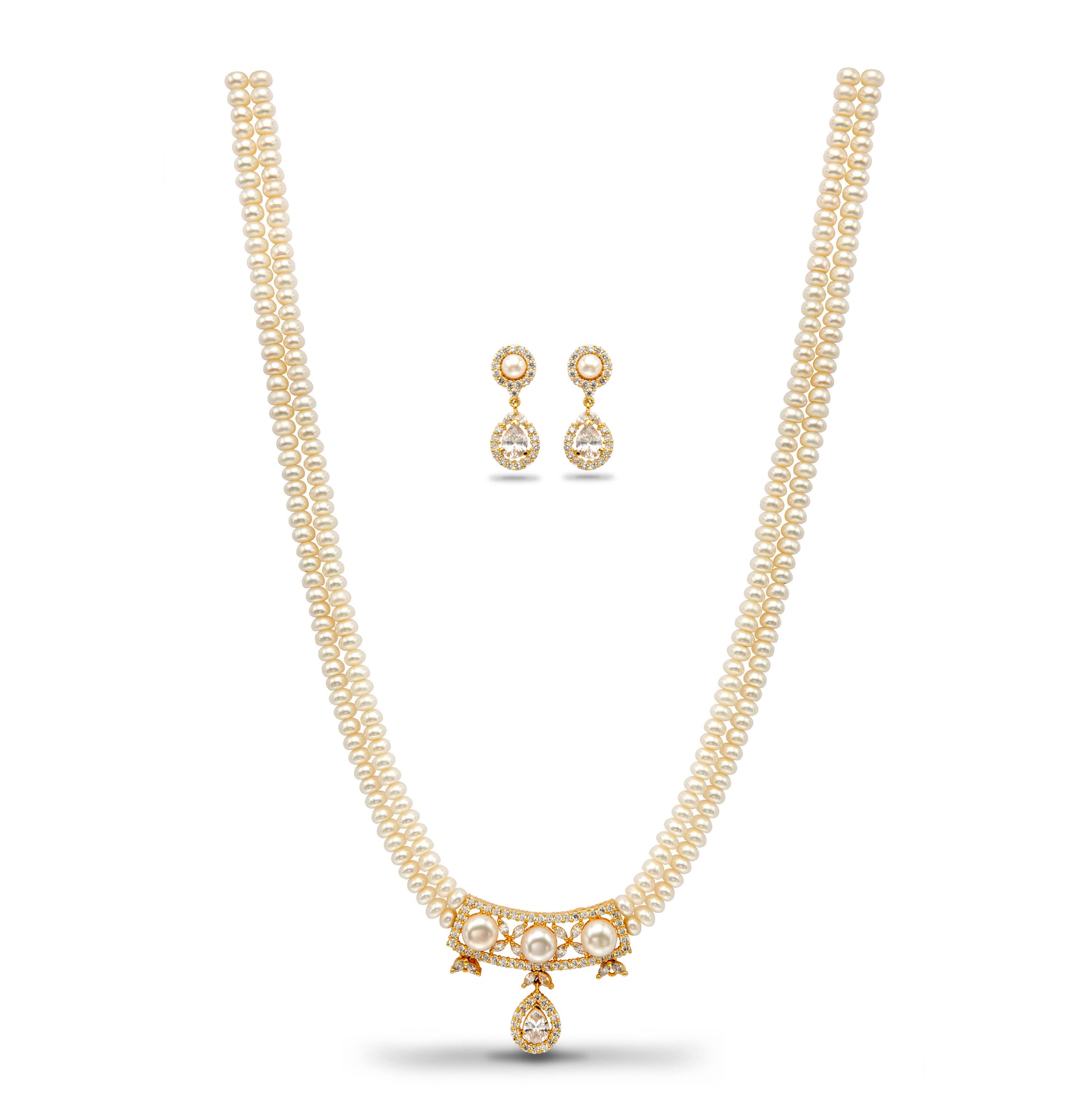 his graceful necklace features 4-5MM white button freshwater cultured pearls of A quality, delicately arranged in two rows measuring 16 inches. The centerpiece is an elegant U-shape pendant adorned with a white stone, blending classic pearl beauty with modern sophistication. With a life-long guarantee on pearls, this necklace ensures lasting elegance and value. Perfect for weddings, festive occasions, or evening gatherings, it pairs effortlessly with both traditional and contemporary outfits.