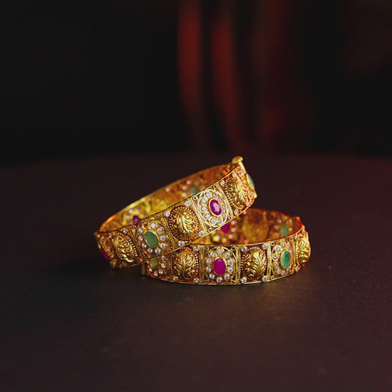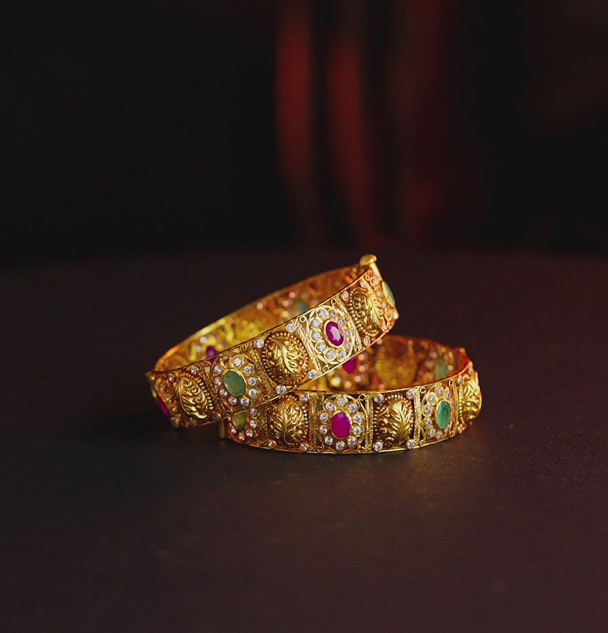 Enquire Now On WhatsAppRadiate timeless charm with the Exquisite Emerald Ruby Stone Bangle, a masterpiece of color and craftsmanship. Adorned with vibrant green emeralds and rich red rubies, this bangle captures a perfect balance of grace and grandeur. Each gemstone is meticulously set to highlight its natural brilliance, creating a regal symphony of hues. Ideal for festive occasions, weddings, and grand celebrations, this bangle embodies traditional elegance with a touch of modern sophistication — a true symbol of luxury and refined artistry.