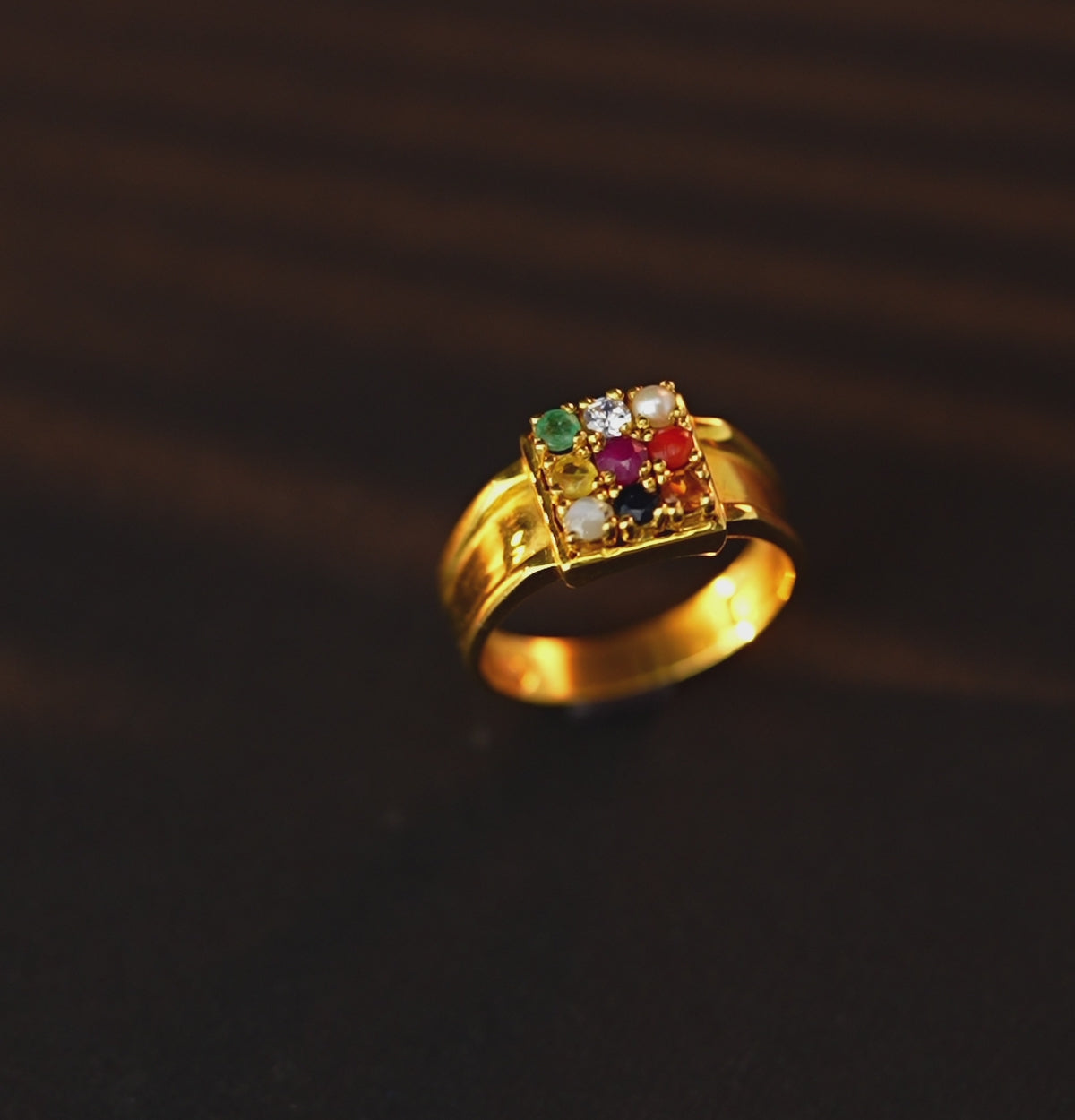 Enquire Now On WhatsAppCelebrate color, tradition, and elegance with the Exquisite Gold Navratan Stone Ring. This magnificent piece features nine precious gemstones—each representing strength, prosperity, wisdom, and harmony—expertly set in a gleaming gold frame. The vibrant mix of hues creates a dazzling play of light, showcasing fine craftsmanship and timeless design. A true symbol of opulence, it blends cultural heritage with contemporary sophistication.