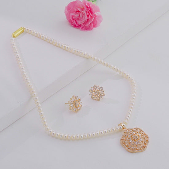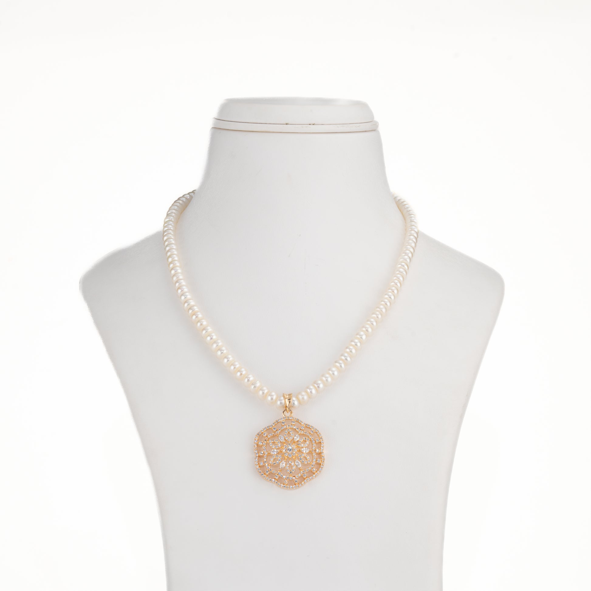 This elegant necklace is strung with 4-5MM white button freshwater cultured pearls of A quality, arranged in a single 16-inch row. The highlight is a graceful single kundan pendant with a white stone, adding a refined touch of traditional charm to the timeless pearl design. Backed by a life-long guarantee on pearls, this necklace is a versatile piece, perfect for festive occasions, weddings, and cultural celebrations. It pairs beautifully with ethnic wear as well as contemporary outfits for a graceful statement look.