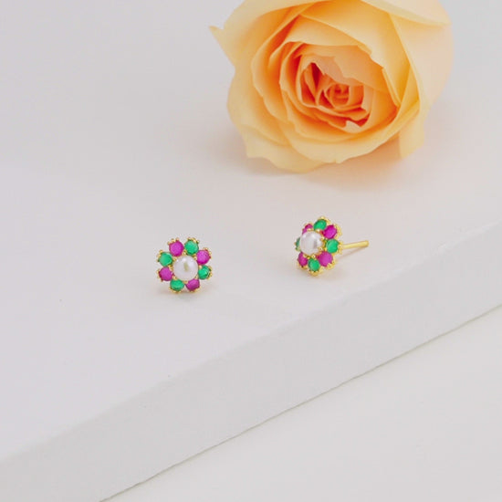 Floral Red Green Multicolor Freshwater Pearl Stud Earrings