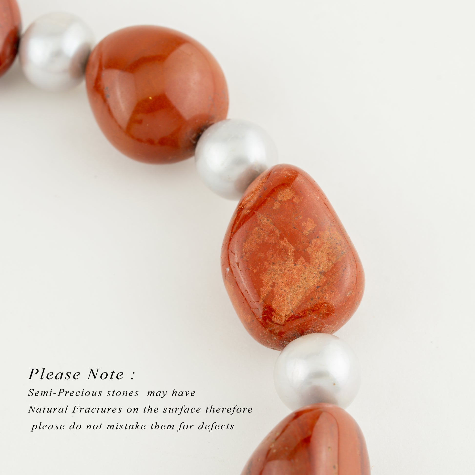 The stones in this necklace appear to be Red Jasper — a semi-precious gemstone known for its rich reddish-brown hue and smooth, polished surface. It’s often paired with pearls (as in this piece) to create an elegant contrast between the earthy red and the soft white or silver tones.