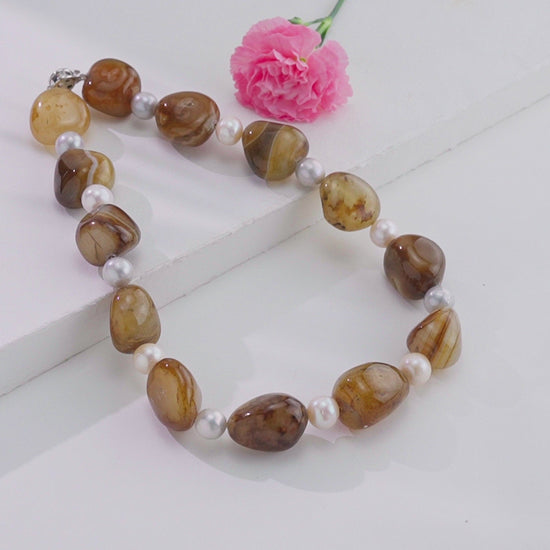 Celebrate natural elegance with this exquisite necklace featuring earthy brown agate beads beautifully paired with multicolor freshwater cultured pearls. The warm, rich tones of agate harmonize with the radiant hues of the pearls, creating a captivating balance of color and sophistication.