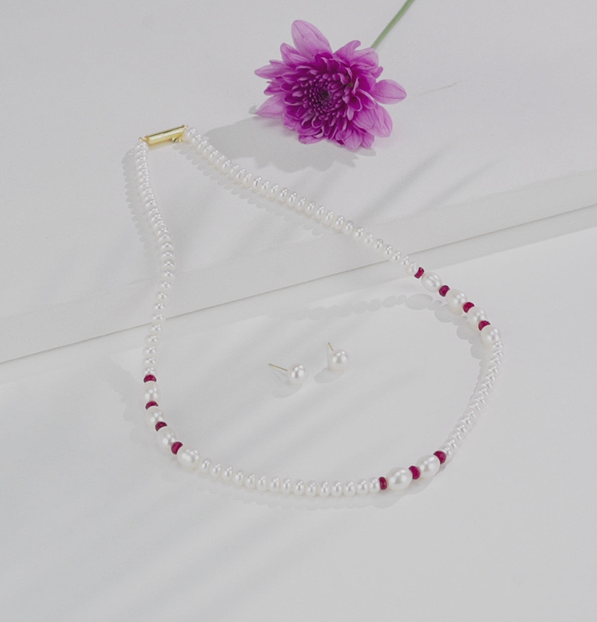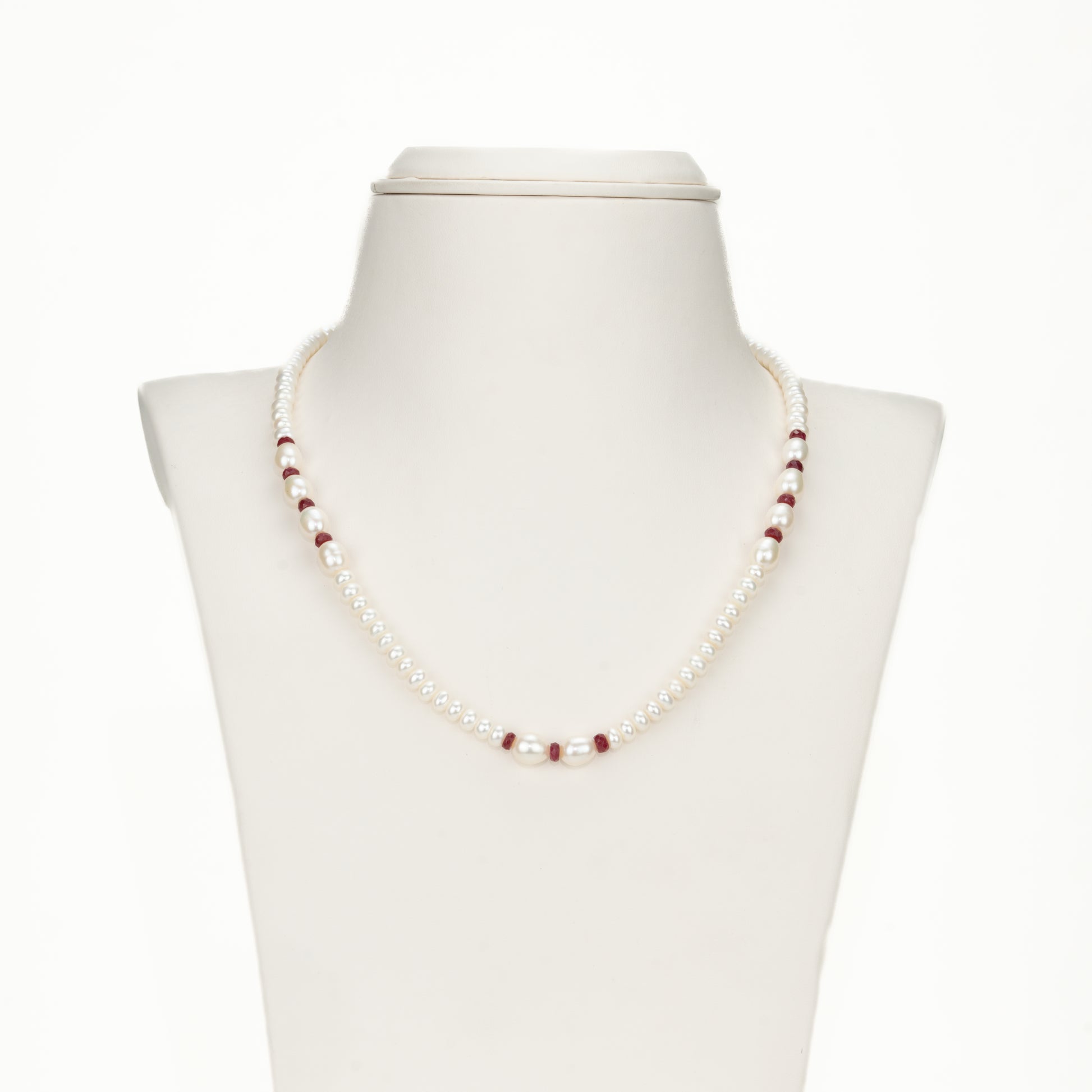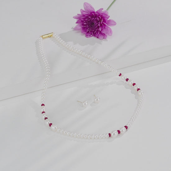 The Natural Ruby and 3.0–4.0mm Freshwater Pearl Necklace Set (Product Code: FWPMM10) is a beautiful blend of elegance and vibrant charm. This 18-inch, single-row necklace features white freshwater cultured pearls in a graceful mix of shapes, sized 3–4 mm and graded A quality for their smooth finish and radiant luster. With an approximate pearl weight of 24.500 grams, the design is enhanced by striking natural ruby stones in a rich red hue, adding warmth and sophistication. Ideal for special occasions or refined everyday wear, this necklace comes with a life-long guarantee on pearls and natural stones.