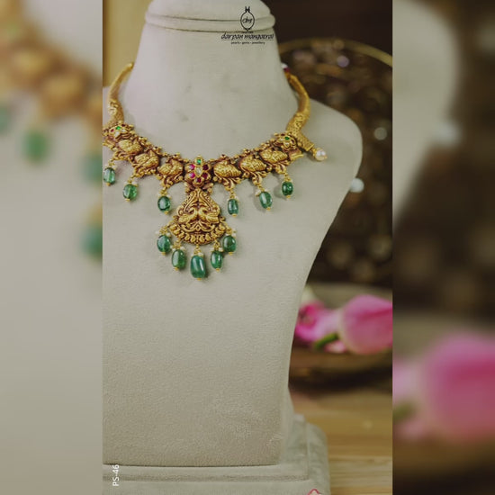 Enquire Now On WhatsAppIntroducing the Genuine Gold Emerald Necklace Set, a luxurious blend of elegance and sophistication. Crafted with authentic gold and adorned with rich emeralds, this set exudes timeless charm and refined beauty. Each gemstone is meticulously set to create a harmonious and striking design, reflecting exceptional craftsmanship. Lightweight yet regal, it sits comfortably while enhancing the neckline with grace. Perfect for weddings, festive celebrations, or special occasions, this necklace set pairs beautifully with traditional sarees, lehengas, and contemporary ensembles alike, adding a touch of opulent elegance and vibrant sophistication to your attire, making every occasion truly memorable and stylish.