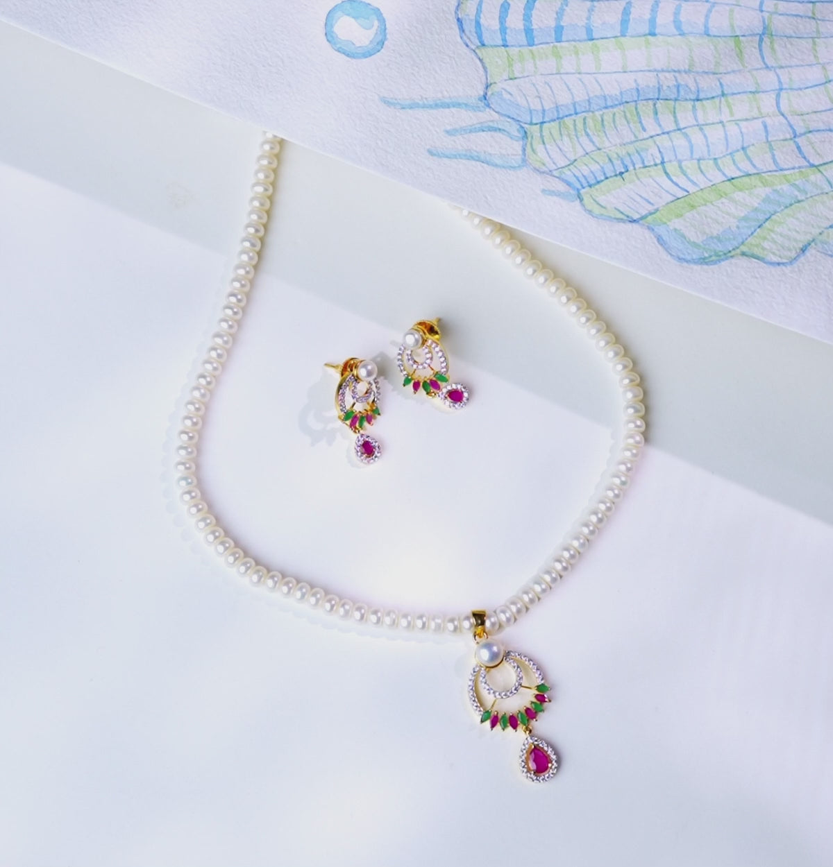 Glowy Red Green Freshwater Pearl Necklace Set
