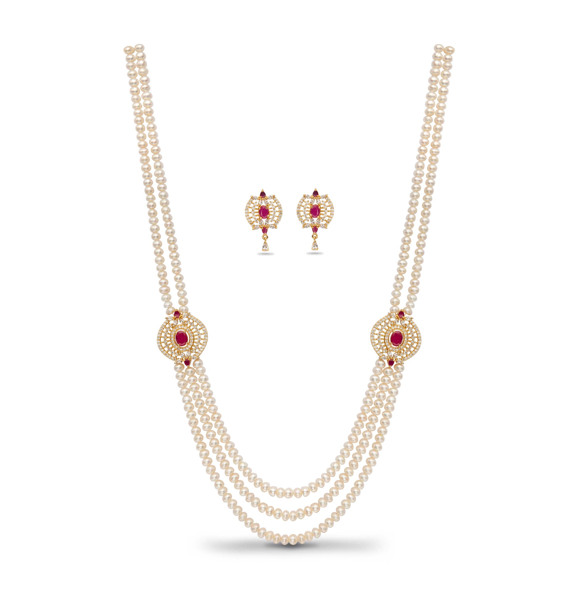 Gorgeous Red Stone Side Piece Freshwater Pearl Necklace Set