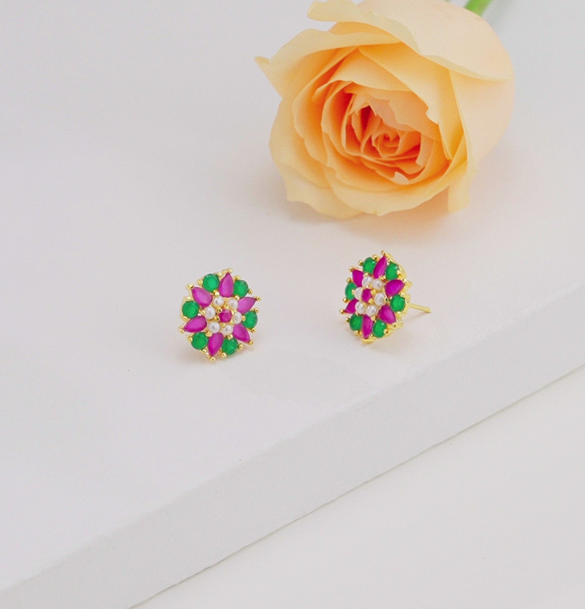 Graceful Red Green Multicolor Freshwater Pearl Stud Earrings, featuring 2-3MM round white freshwater cultured pearls of A quality. The luminous pearls are beautifully accented with vibrant red and green stones, making them a versatile and eye-catching accessory. Backed by our Life Long Guarantee on Pearls, these earrings are perfect for festive occasions, cultural celebrations, or adding a graceful touch to everyday wear.
