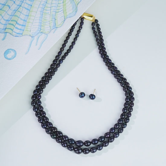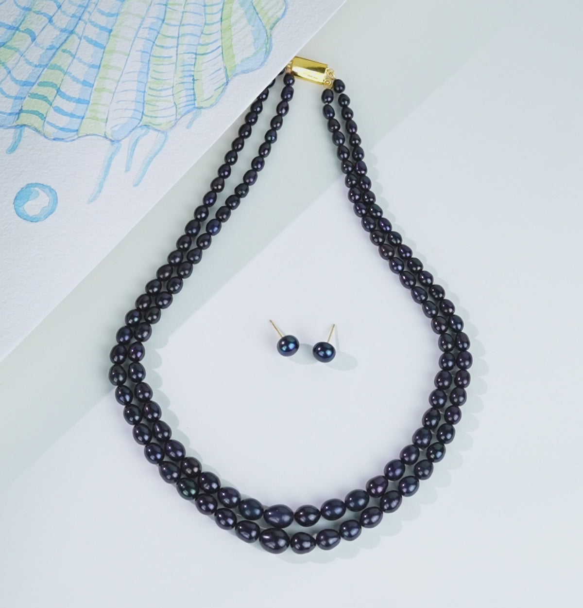 Product Code PN5C features a timeless Freshwater Cultured Pearl necklace set designed with elegant black drop-shaped pearls. With two rows of pearls measuring 18 inches in length and weighing approximately 60.500 grams, this necklace radiates sophistication. The pearls are of A quality, showcasing natural charm and luster. A perfect blend of classic beauty and modern appeal, this set comes with a life-long guarantee on pearls, ensuring lasting value. Ideal for weddings, festive occasions, and evening wear, it complements both traditional attire and contemporary outfits with effortless grace.