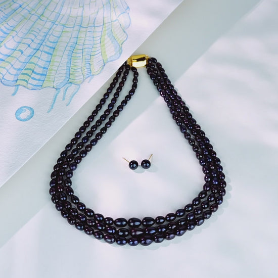 This bold and elegant necklace features 3 rows of freshwater cultured pearls in a rich black hue with a refined drop shape. Graded for top-tier A-quality, each strand spans 18 inches and collectively weighs approximately 89.400 grams. The grading variation in pearl size adds unique character and visual depth. Backed by a lifelong guarantee on pearls, this timeless piece blends sophistication with durability. Its striking black tone makes it perfect for evening events, cocktail parties, and contemporary celebrations, pairing beautifully with sarees, fusion wear, and sleek modern outfits.