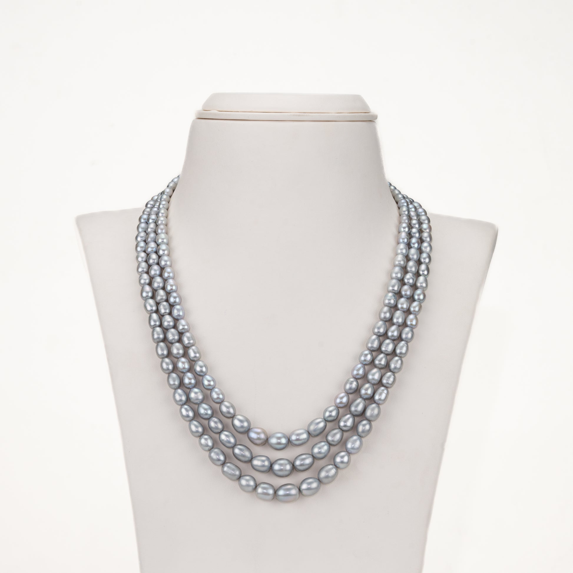 Exude understated elegance with this striking 3-row freshwater cultured pearl necklace . Crafted with rare Kalki-shaped pearls in a refined grey shade, this 18-inch masterpiece is designed for modern sophistication. With a substantial 85.100 g weight and A-grade quality, each strand speaks of fine craftsmanship and enduring beauty. Backed by a lifelong pearl guarantee, it promises both luxury and longevity. Perfect for weddings, formal events, or evening soirées, its cool grey tone complements both traditional and contemporary ensembles—adding a graceful edge to sarees, cocktail dresses, or Indo-western outfits with effortless style.